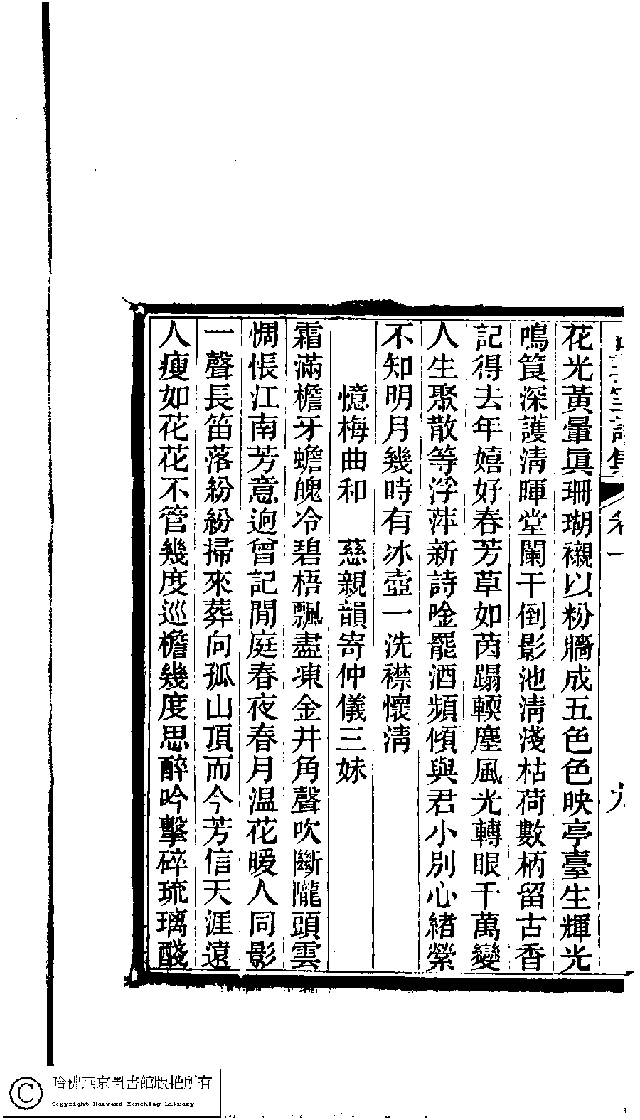 | (PRINT FRIENDLY VERSION) 古歡室集:詩三卷,詞一卷,醫學篇二卷,女學篇一卷,中饋錄一卷(清曽懿撰)。清光緖三十三年(1907)刻本。 ![]() 頁碼 : 1.10a | 点 击 放 大 | 古歡室集:詩三卷,詞一卷,醫學篇二卷,女學篇一卷,中饋錄一卷(清曽懿撰)。清光緖三十三年(1907)刻本。![]() 頁碼 : 1.9b | 点 击 放 大 | 返回 |