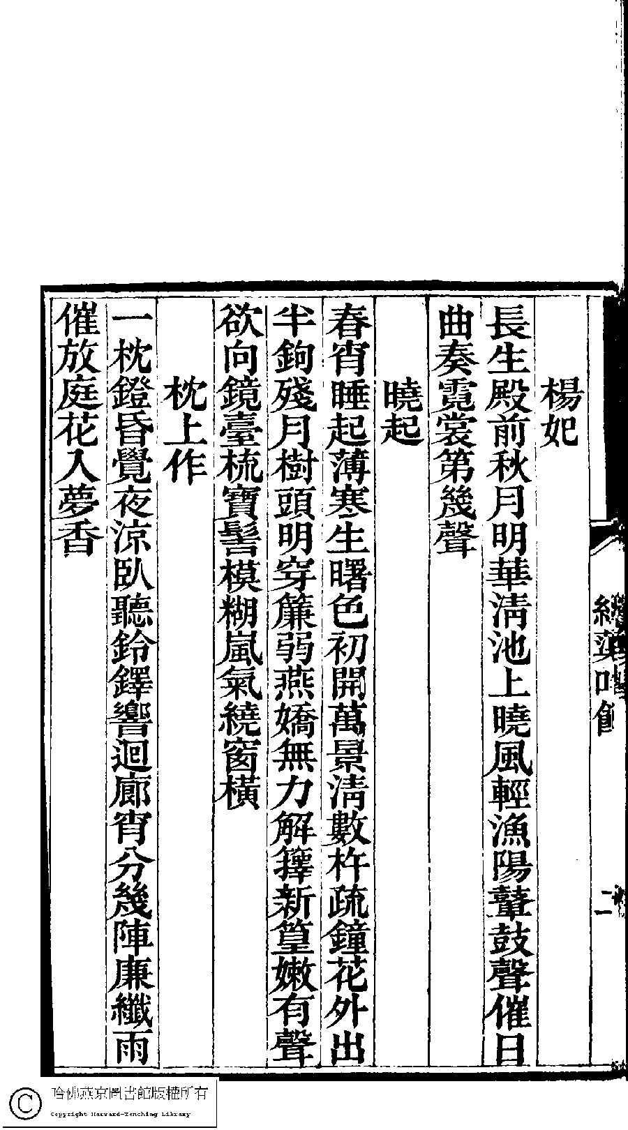 | (PRINT FRIENDLY VERSION) 澹香閣詩鈔:一卷外四種(清李星池等撰) : 紅蕖吟館詩鈔﹕一卷(清楊書蘭撰)。清光緖四年(1878)刻本。 ![]() 頁碼 : 2.2b | 点 击 放 大 | 返回 |