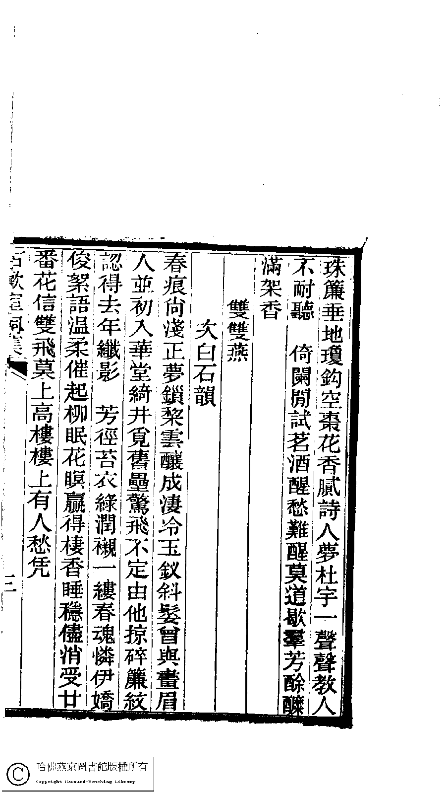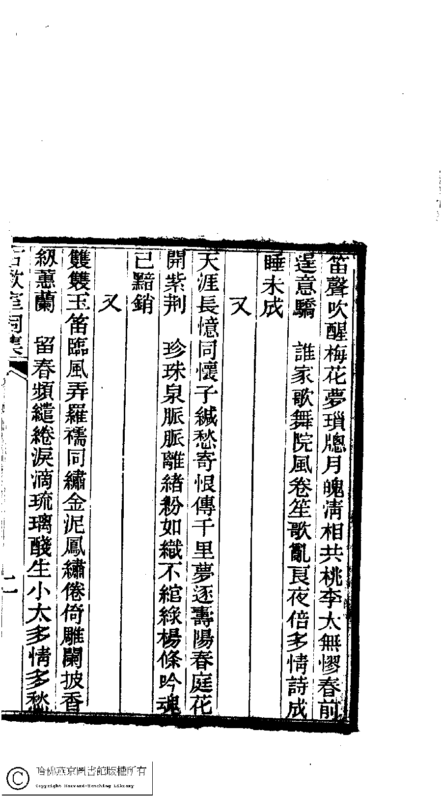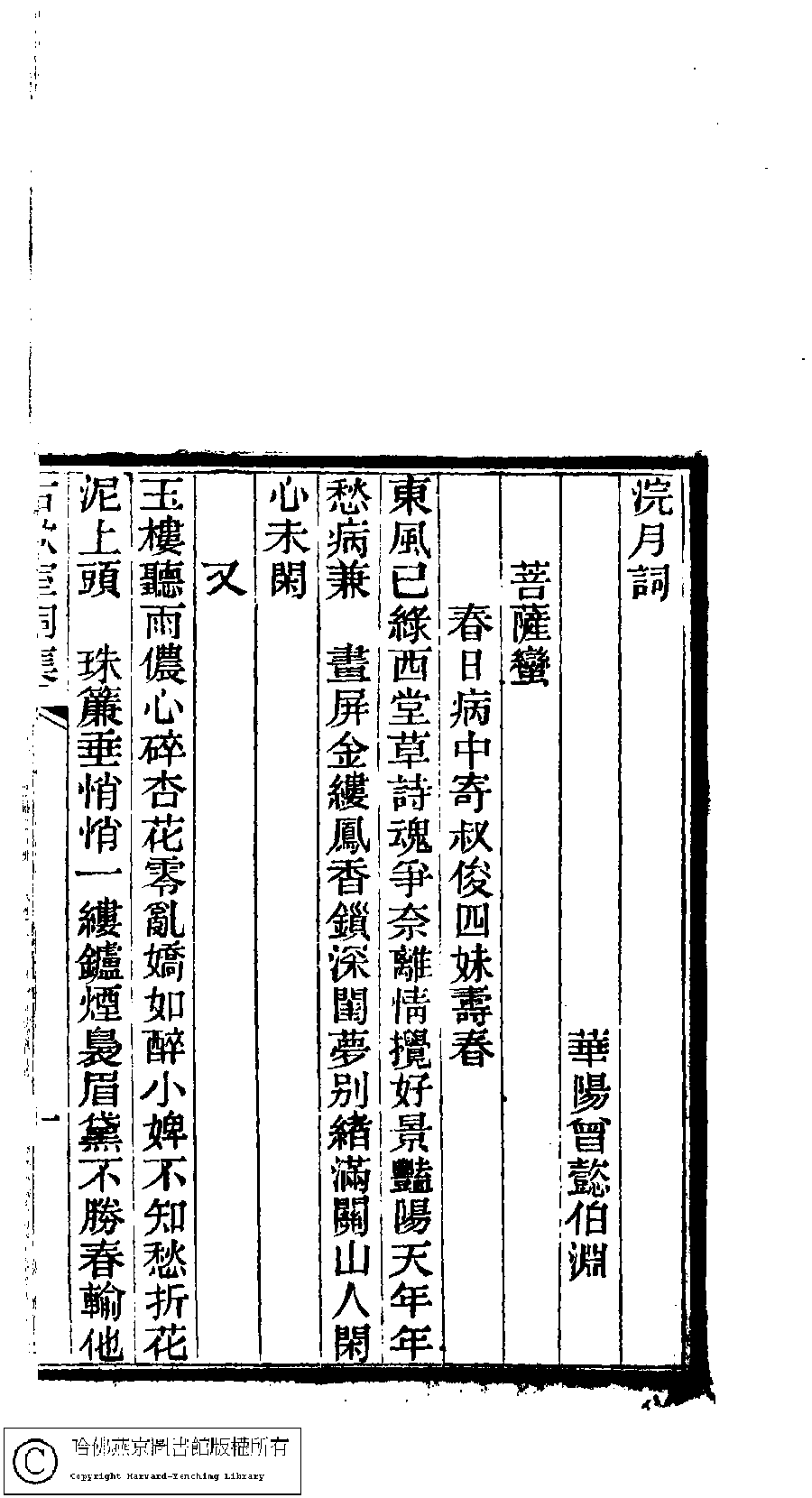 | (PRINT FRIENDLY VERSION) 古歡室集:詩三卷,詞一卷,醫學篇二卷,女學篇一卷,中饋錄一卷(清曽懿撰) ![]() 頁碼 : 詞.2b | 点 击 放 大 | 古歡室集:詩三卷,詞一卷,醫學篇二卷,女學篇一卷,中饋錄一卷(清曽懿撰)![]() 頁碼 : 詞.2a | 点 击 放 大 | 古歡室集:詩三卷,詞一卷,醫學篇二卷,女學篇一卷,中饋錄一卷(清曽懿撰)![]() 頁碼 : 詞.1b | 点 击 放 大 | 古歡室集:詩三卷,詞一卷,醫學篇二卷,女學篇一卷,中饋錄一卷(清曽懿撰)![]() 頁碼 : 詞.1a | 点 击 放 大 |
