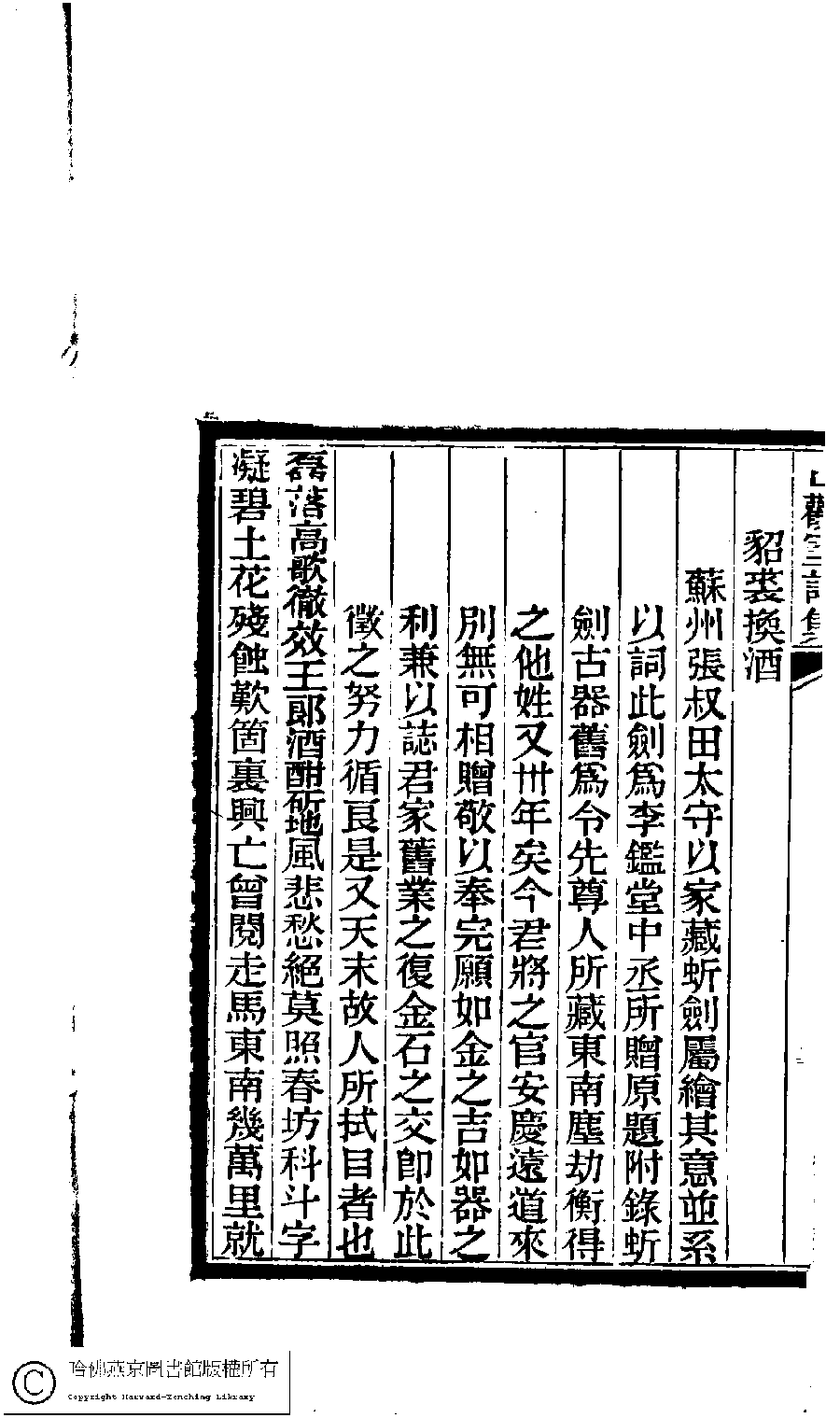 詩詞 [貂裘換酒 ﹕蘇州張叔田太守以家藏蚚劍屬繪其意並系以詞此劍為李鑑堂中丞所贈原題附錄蚚劍古器舊為令先尊人所藏東南塵劫衡得之他姓又卅年矣今君將之官安慶遠道來別無可相贈敬以奉完願如金之吉]