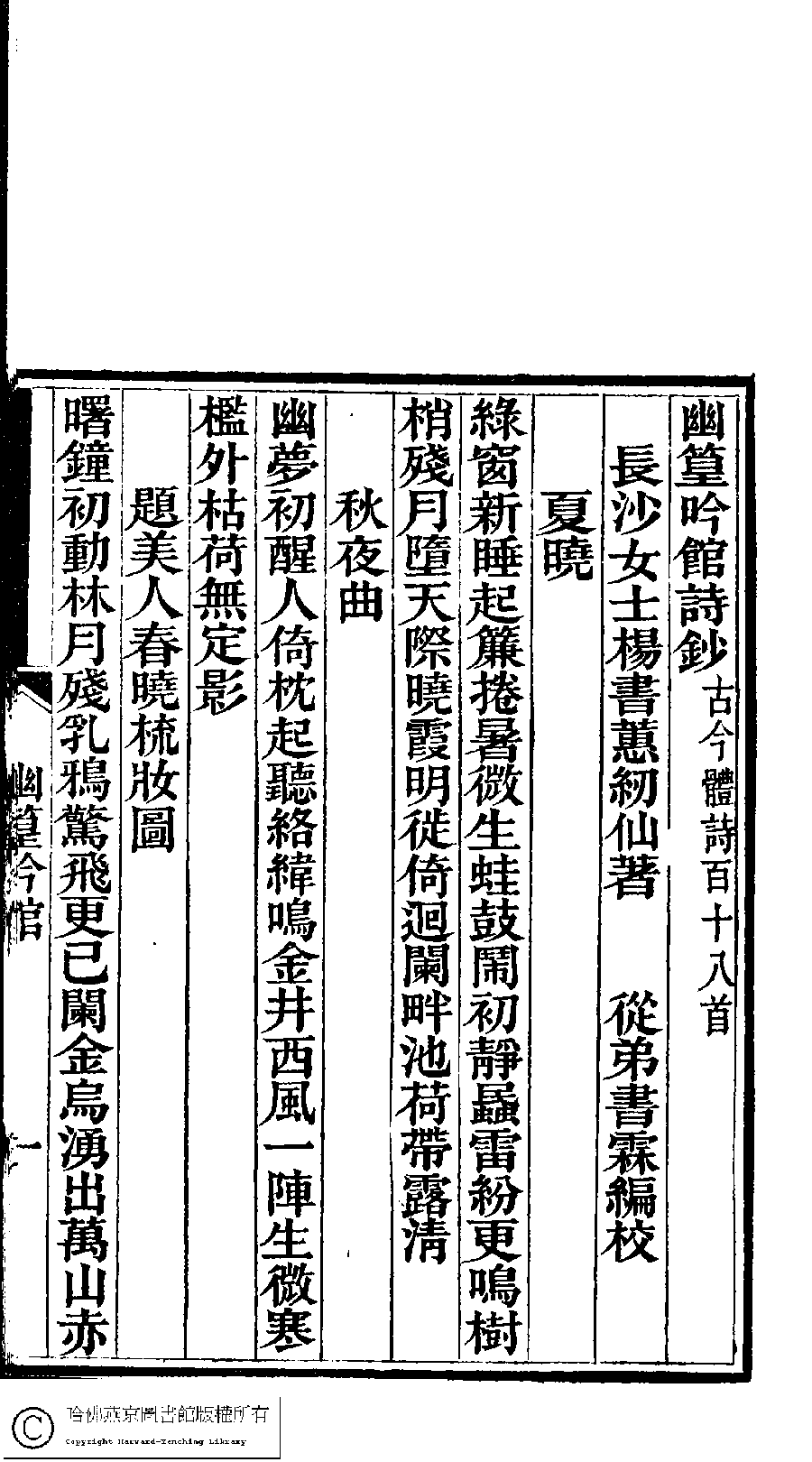 | 原書: 澹香閣詩鈔:一卷外四種(清李星池等撰): 幽篁吟館詩鈔﹕一卷(清楊書蕙撰) |