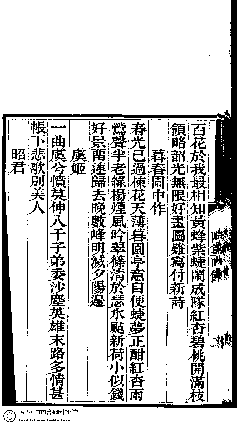 | (PRINT FRIENDLY VERSION) 澹香閣詩鈔:一卷外四種(清李星池等撰) : 幽篁吟館詩鈔﹕一卷(清楊書蕙撰)。清光緖四年(1878)刻本。 ![]() 頁碼 : 3.2b | 点 击 放 大 | 返回 |