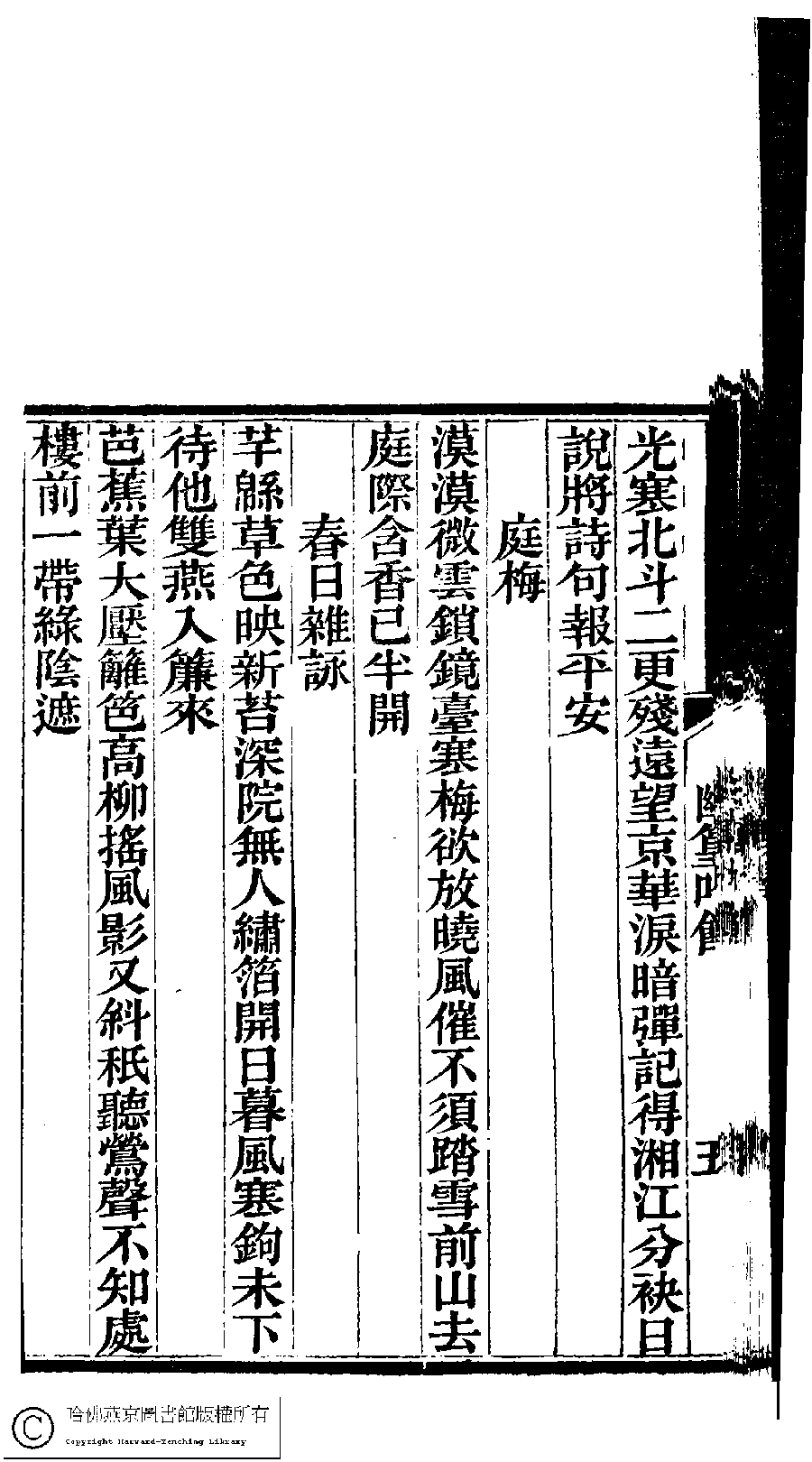 | (PRINT FRIENDLY VERSION) 澹香閣詩鈔:一卷外四種(清李星池等撰) : 幽篁吟館詩鈔﹕一卷(清楊書蕙撰)。清光緖四年(1878)刻本。 ![]() 頁碼 : 3.5b | 点 击 放 大 | 返回 |