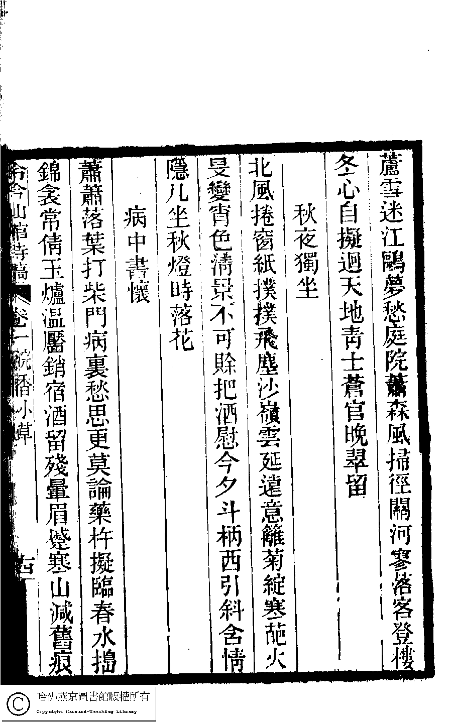 | 原書: 冷吟仙舘詩稿﹕八卷﹐詩餘一卷﹐文存一卷(淸左錫嘉撰) |