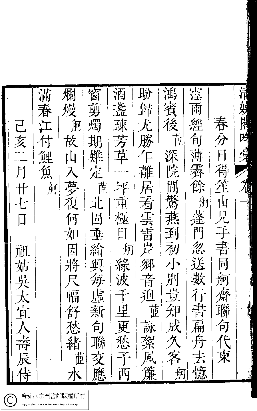 | (PRINT FRIENDLY VERSION) 清娛閣吟稾﹕六卷(清鮑之蕙撰)。嘉慶16年 [1811]刻本 ![]() 頁碼 : 1.11a | 点 击 放 大 | 清娛閣吟稾﹕六卷(清鮑之蕙撰)。嘉慶16年 [1811]刻本![]() 頁碼 : 1.10b | 点 击 放 大 | 返回 |