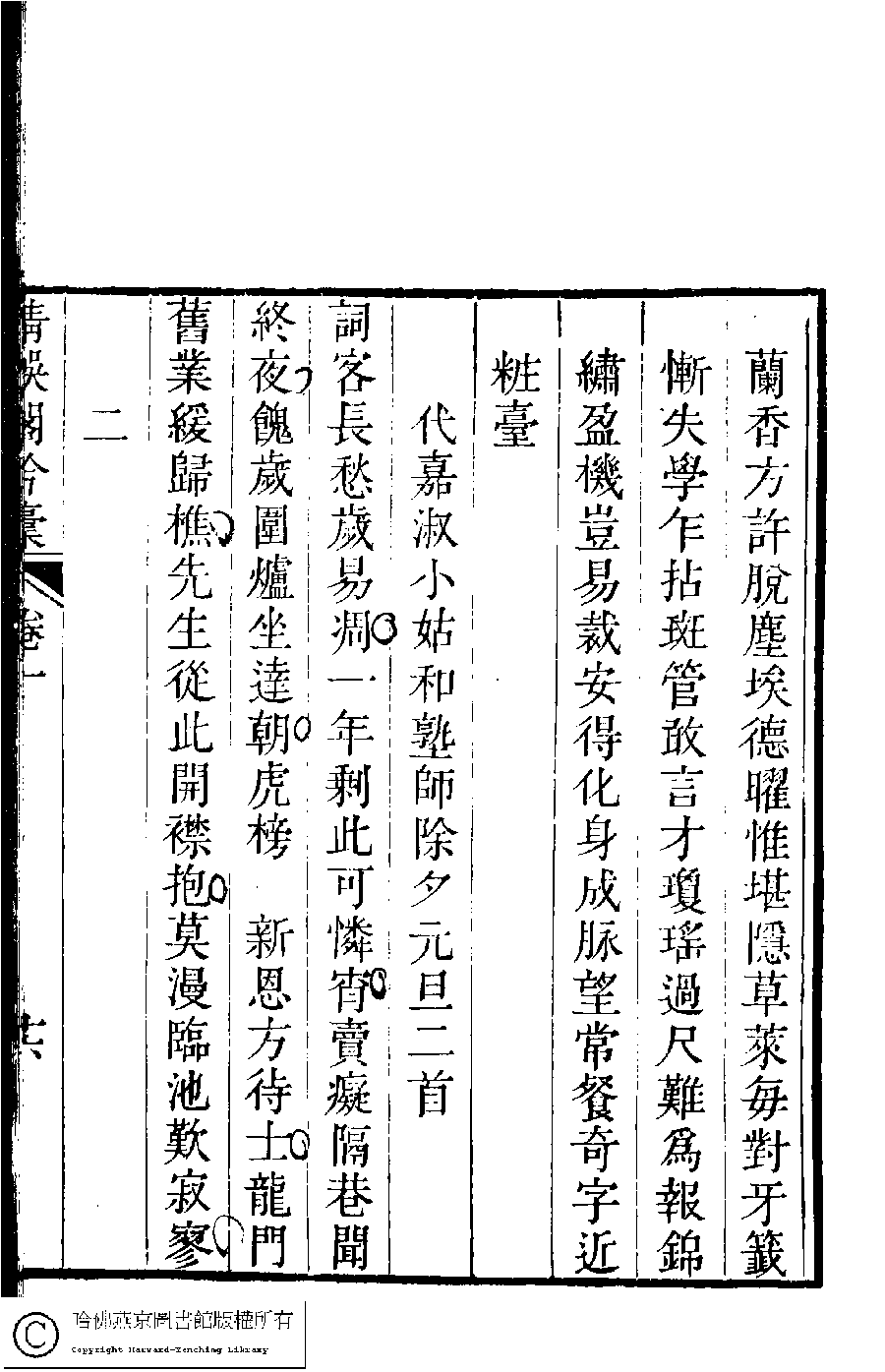 | (PRINT FRIENDLY VERSION) 清娛閣吟稾﹕六卷(清鮑之蕙撰)。嘉慶16年 [1811]刻本 ![]() 頁碼 : 1.16a | 点 击 放 大 | 清娛閣吟稾﹕六卷(清鮑之蕙撰)。嘉慶16年 [1811]刻本![]() 頁碼 : 1.15b | 点 击 放 大 | 返回 |