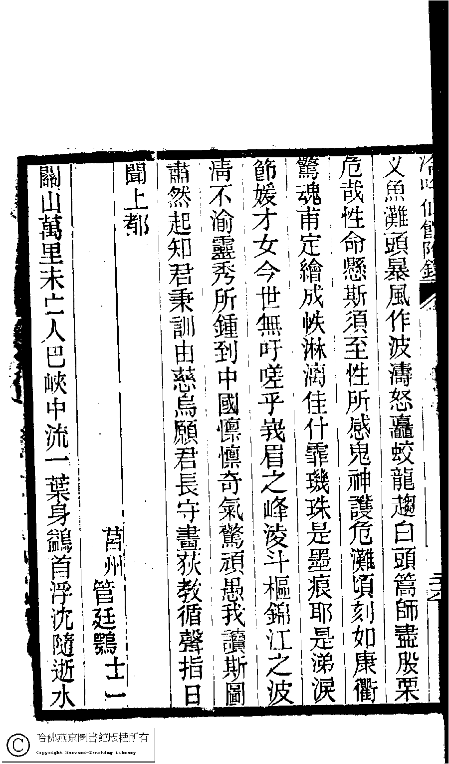| 原書: 冷吟仙舘詩稿﹕八卷﹐詩餘一卷﹐文存一卷(淸左錫嘉撰) |