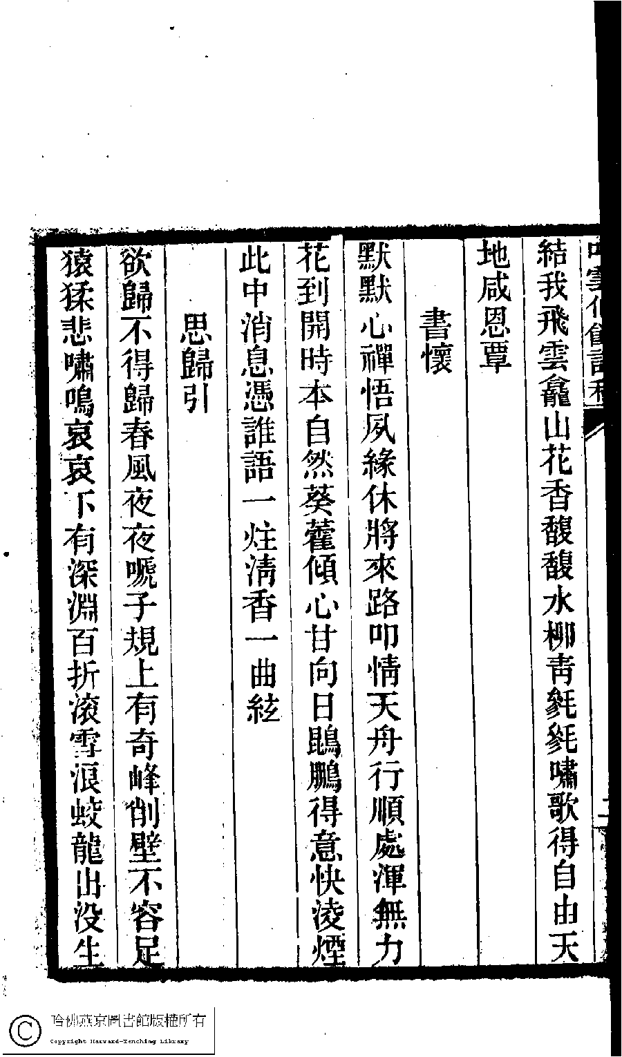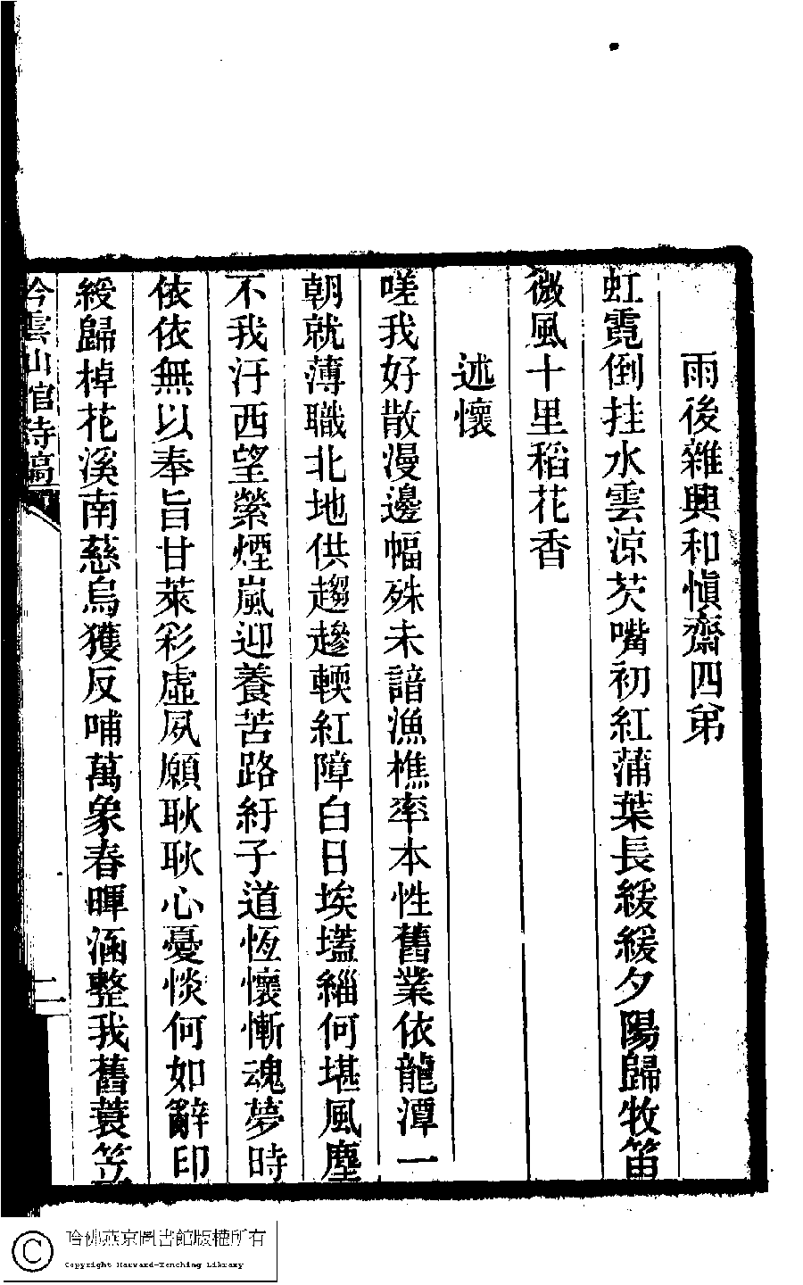 | (PRINT FRIENDLY VERSION) 冷吟仙舘詩稿﹕八卷﹐詩餘一卷﹐文存一卷(淸左錫嘉撰)。淸光緖辛卯(1891)刻本。 ![]() 頁碼 : 吟雲.2b | 点 击 放 大 | 冷吟仙舘詩稿﹕八卷﹐詩餘一卷﹐文存一卷(淸左錫嘉撰)。淸光緖辛卯(1891)刻本。![]() 頁碼 : 吟雲.2a | 点 击 放 大 | 返回 |