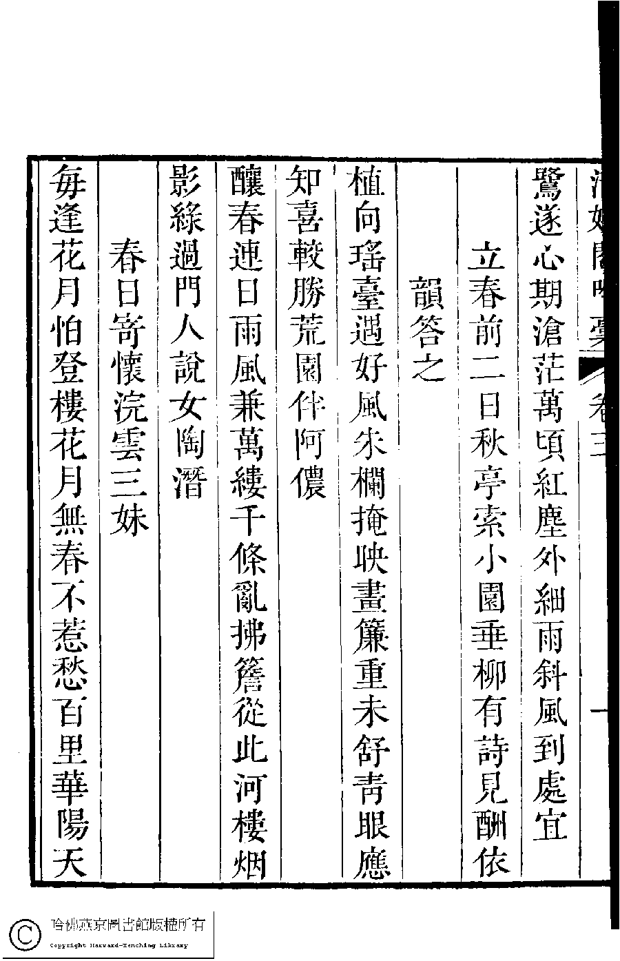 | (PRINT FRIENDLY VERSION) 清娛閣吟稾﹕六卷(清鮑之蕙撰)。嘉慶16年 [1811]刻本 ![]() 頁碼 : 3.1b | 点 击 放 大 | 清娛閣吟稾﹕六卷(清鮑之蕙撰)。嘉慶16年 [1811]刻本![]() 頁碼 : 3.1a | 点 击 放 大 | 返回 |