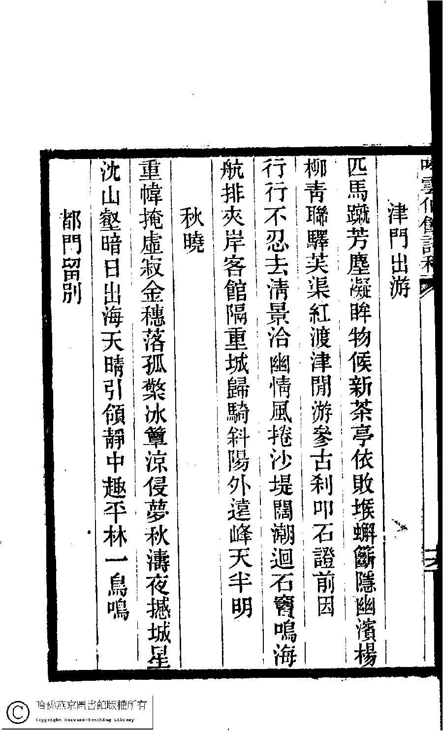| (PRINT FRIENDLY VERSION) 冷吟仙舘詩稿﹕八卷﹐詩餘一卷﹐文存一卷(淸左錫嘉撰)。淸光緖辛卯(1891)刻本。 ![]() 頁碼 : 吟雲.17a | 点 击 放 大 | 冷吟仙舘詩稿﹕八卷﹐詩餘一卷﹐文存一卷(淸左錫嘉撰)。淸光緖辛卯(1891)刻本。![]() 頁碼 : 吟雲.16b | 点 击 放 大 | 返回 |