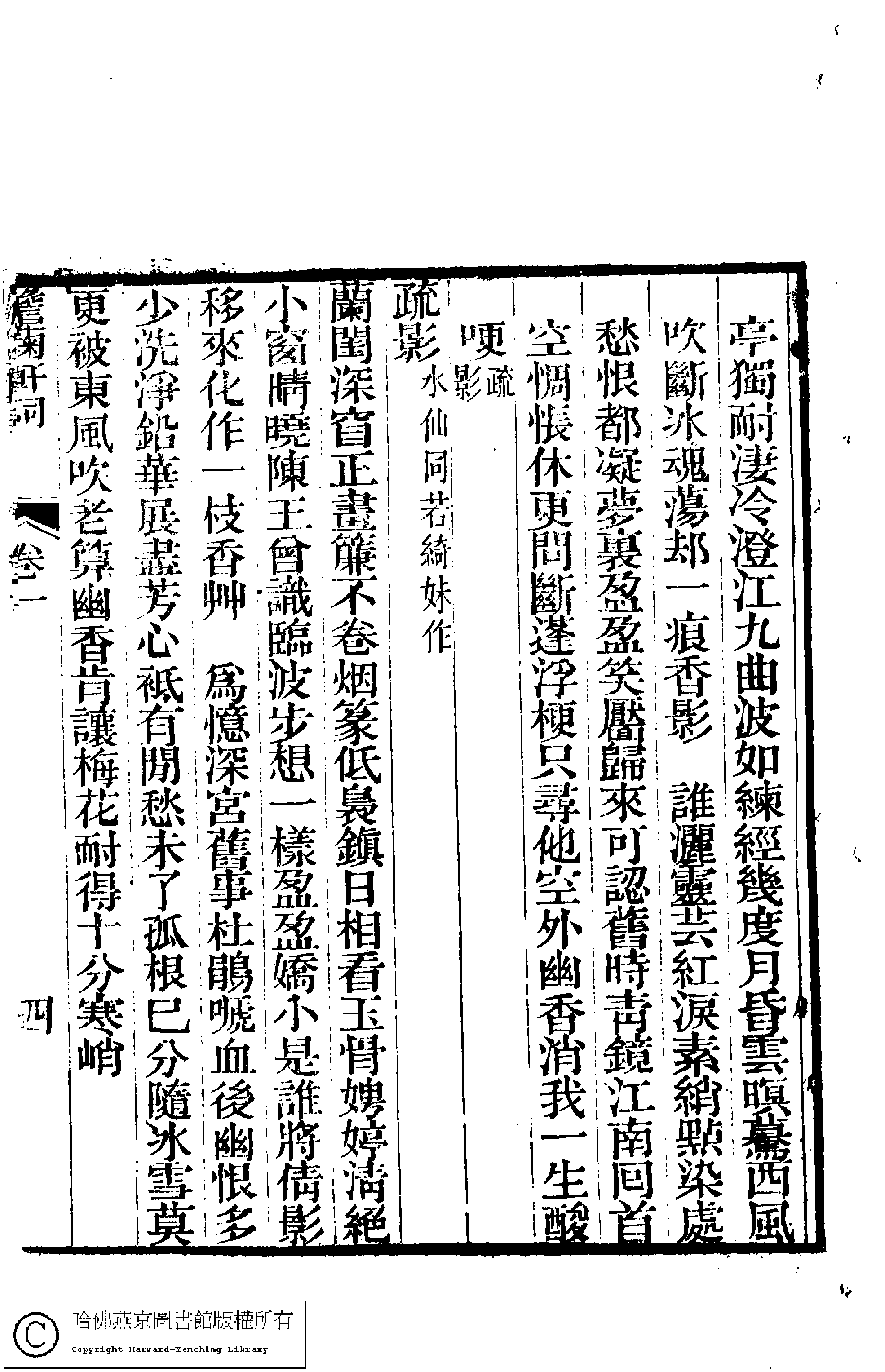 | (PRINT FRIENDLY VERSION) 澹蘜軒詩初稿﹕四卷﹐詞﹕一卷(清張䌌英撰)。道光二十年(1840)刻本。 ![]() 頁碼 : 詞.4a | 点 击 放 大 | 澹蘜軒詩初稿﹕四卷﹐詞﹕一卷(清張䌌英撰)。道光二十年(1840)刻本。![]() 頁碼 : 詞.3b | 点 击 放 大 | 返回 |