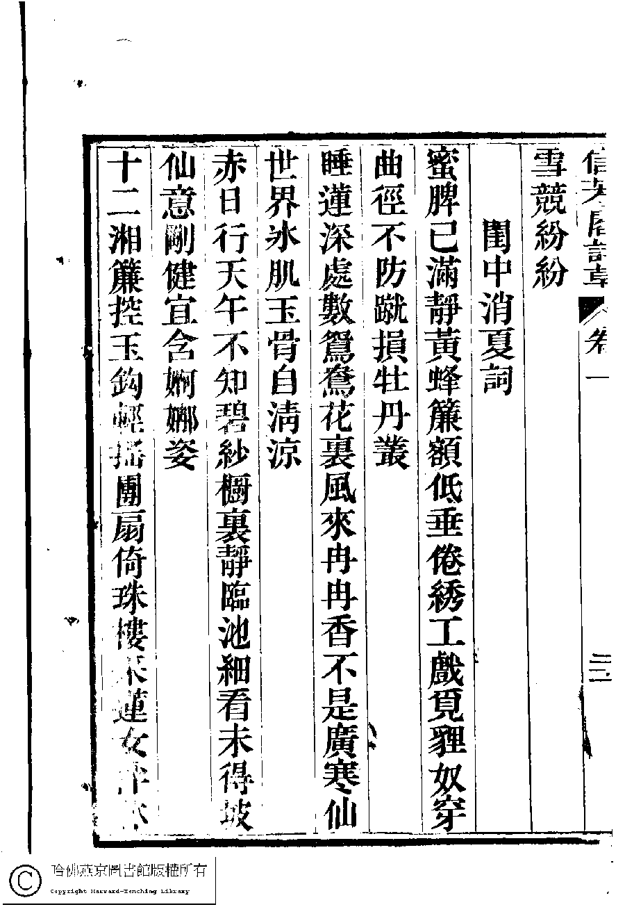 | (PRINT FRIENDLY VERSION) 信芳閣詩草﹕五卷(清陳蘊蓮撰)。清咸豐九年(1859)刻本。 ![]() 頁碼 : 1.21b | 点 击 放 大 | 信芳閣詩草﹕五卷(清陳蘊蓮撰)。清咸豐九年(1859)刻本。![]() 頁碼 : 1.21a | 点 击 放 大 | 返回 |