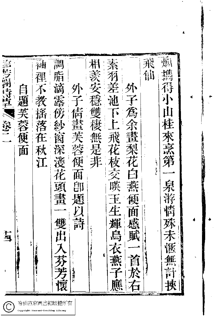 | (PRINT FRIENDLY VERSION) 信芳閣詩草﹕五卷(清陳蘊蓮撰)。清咸豐九年(1859)刻本。 ![]() 頁碼 : 2.14a | 点 击 放 大 | 返回 |