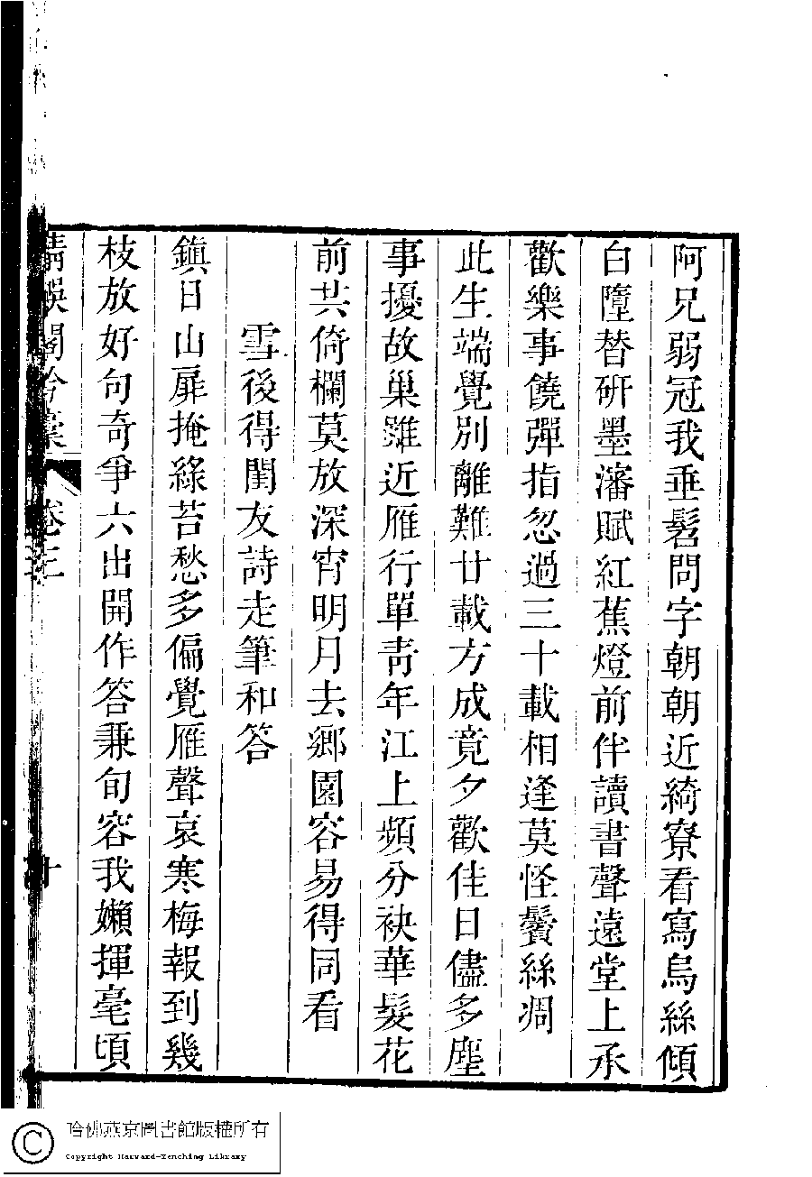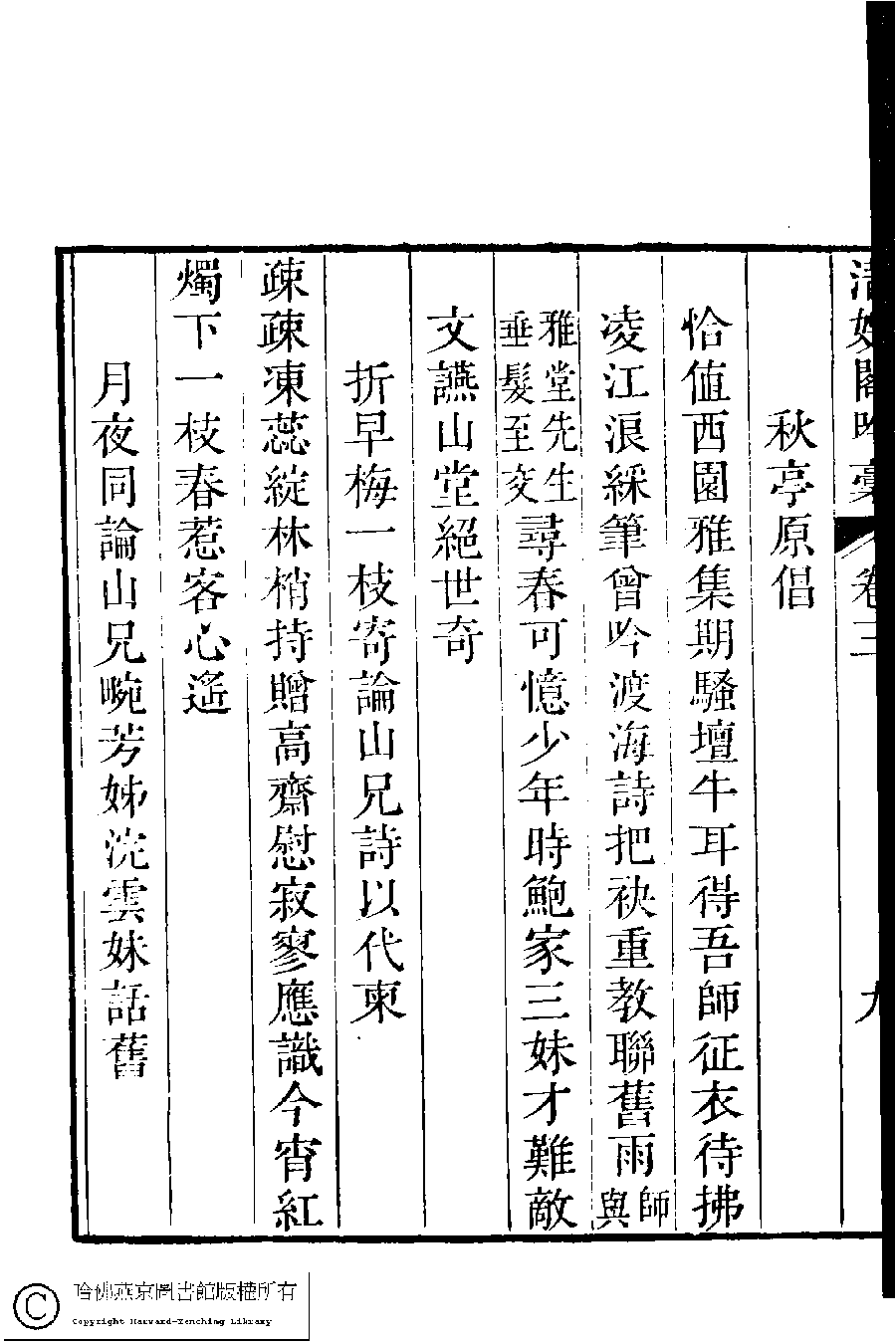 | (PRINT FRIENDLY VERSION) 清娛閣吟稾﹕六卷(清鮑之蕙撰)。嘉慶16年 [1811]刻本 ![]() 頁碼 : 3.10a | 点 击 放 大 | 清娛閣吟稾﹕六卷(清鮑之蕙撰)。嘉慶16年 [1811]刻本![]() 頁碼 : 3.9b | 点 击 放 大 | 返回 |