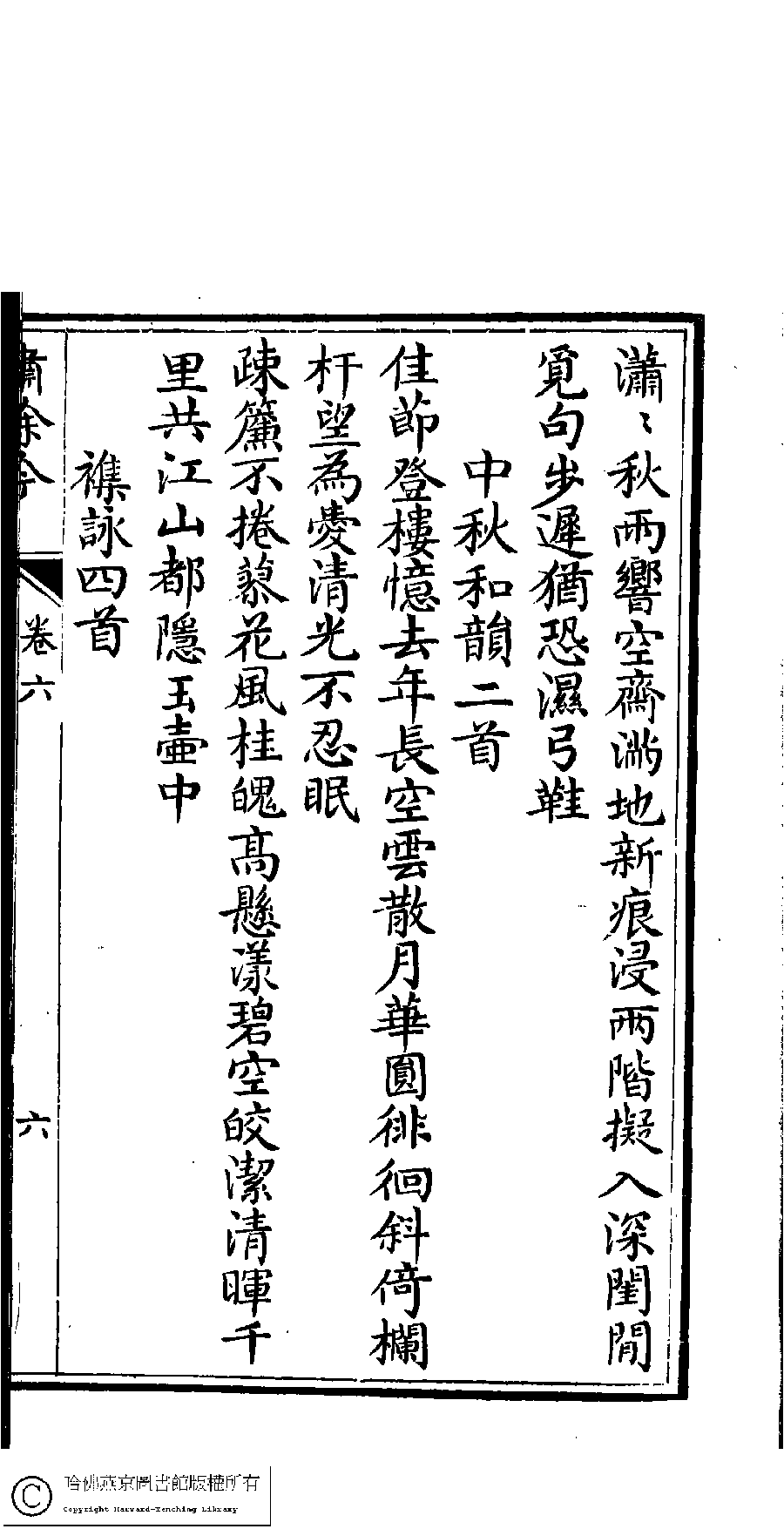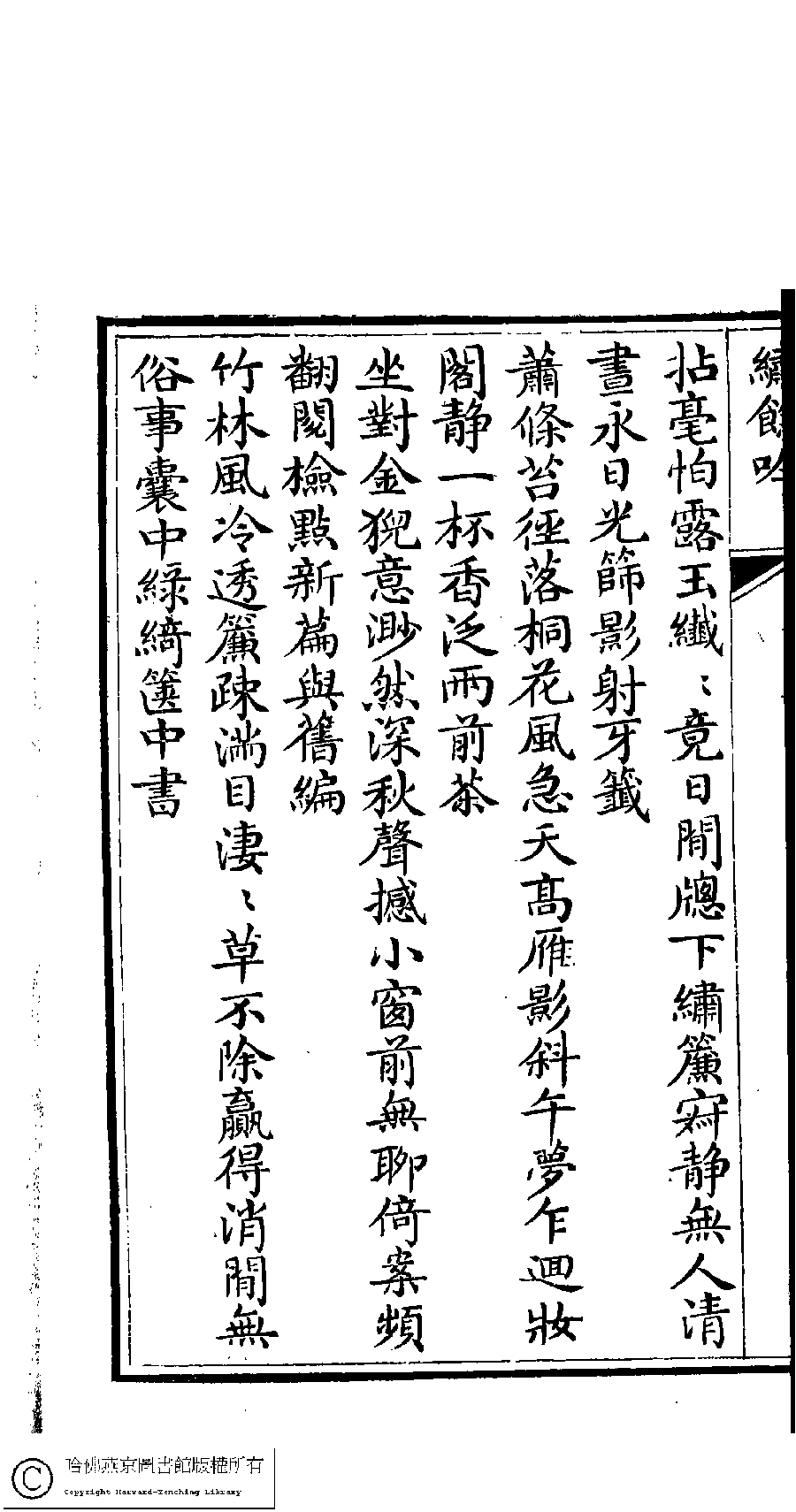 | 原書: 繡餘吟﹕六卷﹐附詩餘一卷(清馮思慧撰) |
