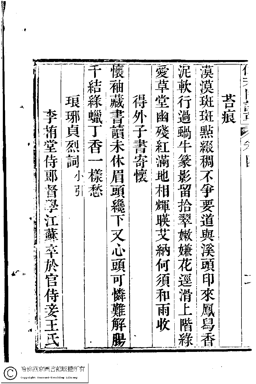| (PRINT FRIENDLY VERSION) 信芳閣詩草﹕五卷(清陳蘊蓮撰)。清咸豐九年(1859)刻本。 ![]() 頁碼 : 4.17b | 点 击 放 大 | 返回 |