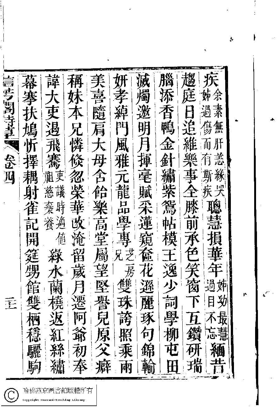 | (PRINT FRIENDLY VERSION) 信芳閣詩草﹕五卷(清陳蘊蓮撰) ![]() 頁碼 : 4.21b | 点 击 放 大 | 信芳閣詩草﹕五卷(清陳蘊蓮撰)![]() 頁碼 : 4.21a | 点 击 放 大 | 信芳閣詩草﹕五卷(清陳蘊蓮撰)![]() 頁碼 : 4.20b | 点 击 放 大 | 信芳閣詩草﹕五卷(清陳蘊蓮撰)![]() 頁碼 : 4.20a | 点 击 放 大 |