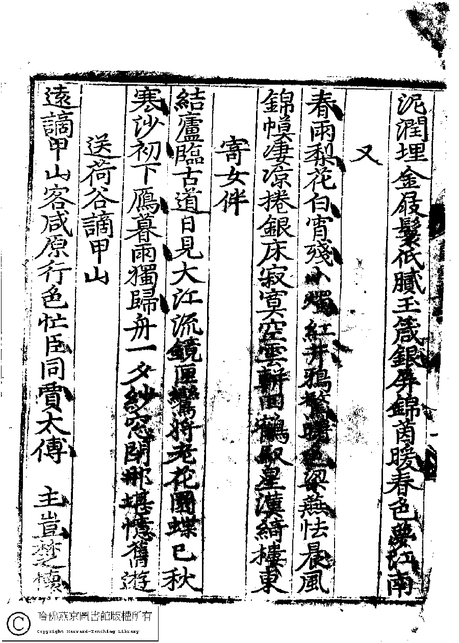 | (PRINT FRIENDLY VERSION) 蘭雪軒詩(Nansŏrhŏn si) (朝鮮許蘭雪撰)。朝鮮(1608?)刻本。 ![]() 頁碼 : 7b | 点 击 放 大 | 返回 |