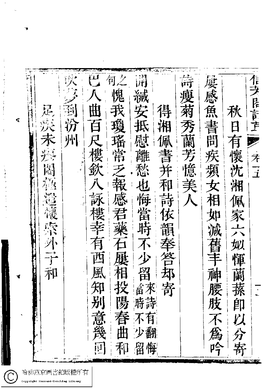 | (PRINT FRIENDLY VERSION) 信芳閣詩草﹕五卷(清陳蘊蓮撰)。清咸豐九年(1859)刻本。 ![]() 頁碼 : 5.5b | 点 击 放 大 | 返回 |