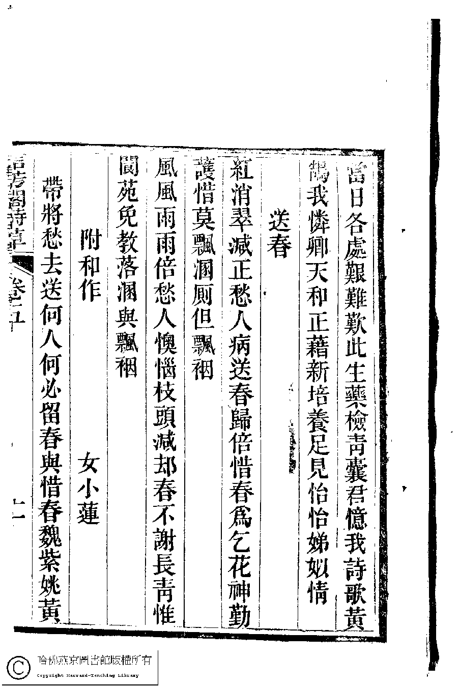 | (PRINT FRIENDLY VERSION) 信芳閣詩草﹕五卷(清陳蘊蓮撰)。清咸豐九年(1859)刻本。 ![]() 頁碼 : 5.11a | 点 击 放 大 | 返回 |