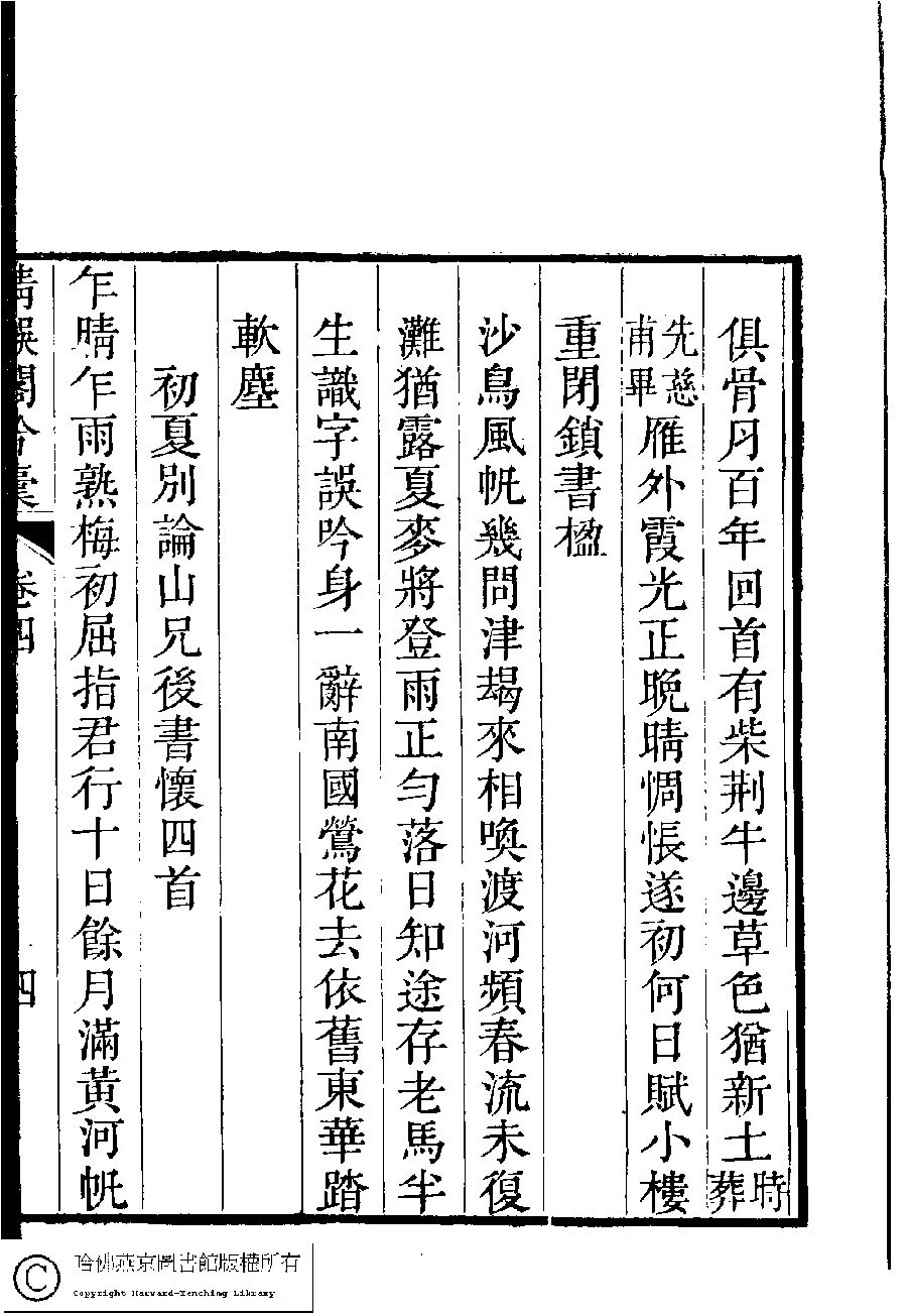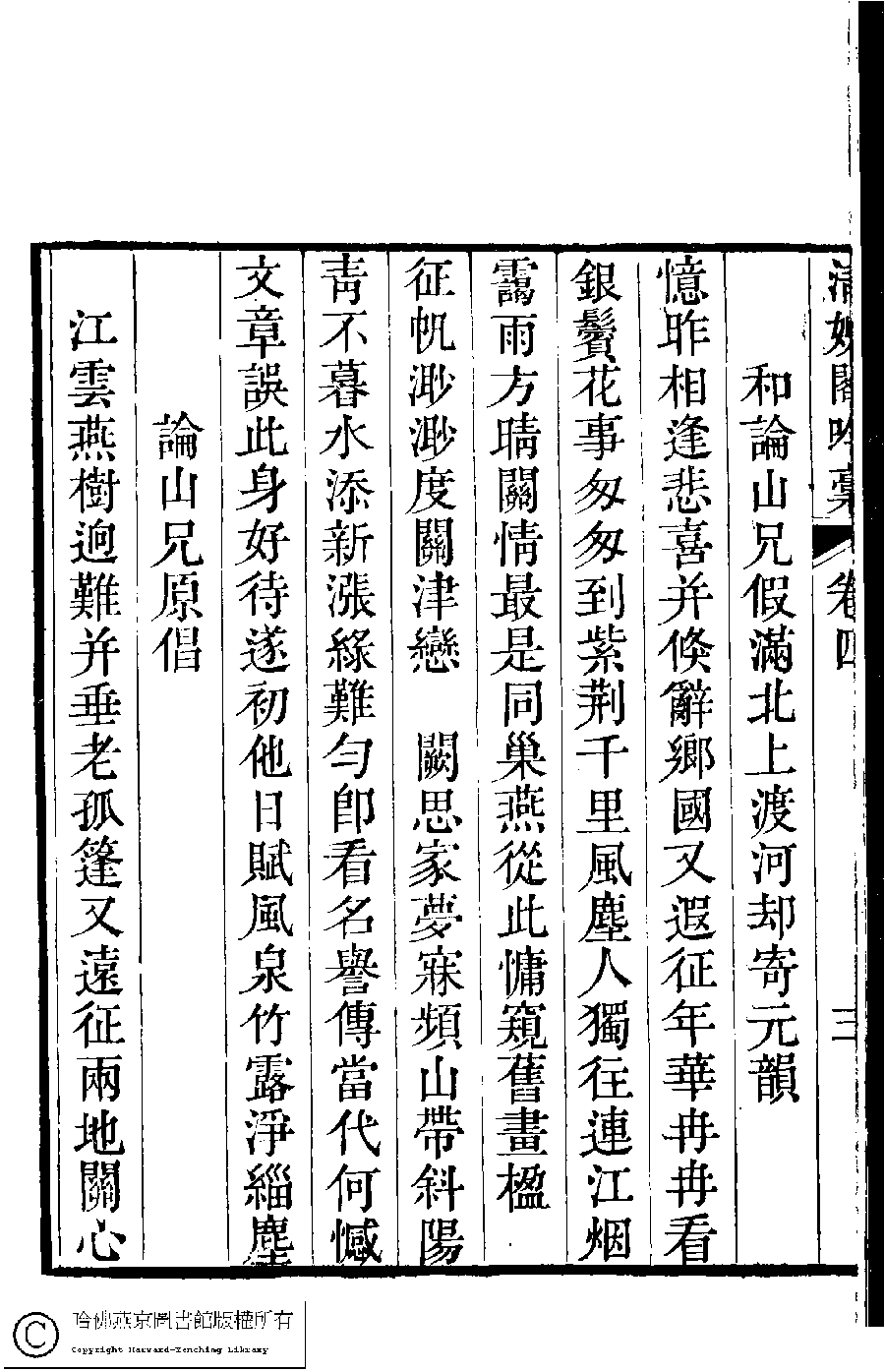 | (PRINT FRIENDLY VERSION) 清娛閣吟稾﹕六卷(清鮑之蕙撰)。嘉慶16年 [1811]刻本 ![]() 頁碼 : 4.4a | 点 击 放 大 | 清娛閣吟稾﹕六卷(清鮑之蕙撰)。嘉慶16年 [1811]刻本![]() 頁碼 : 4.3b | 点 击 放 大 | 返回 |