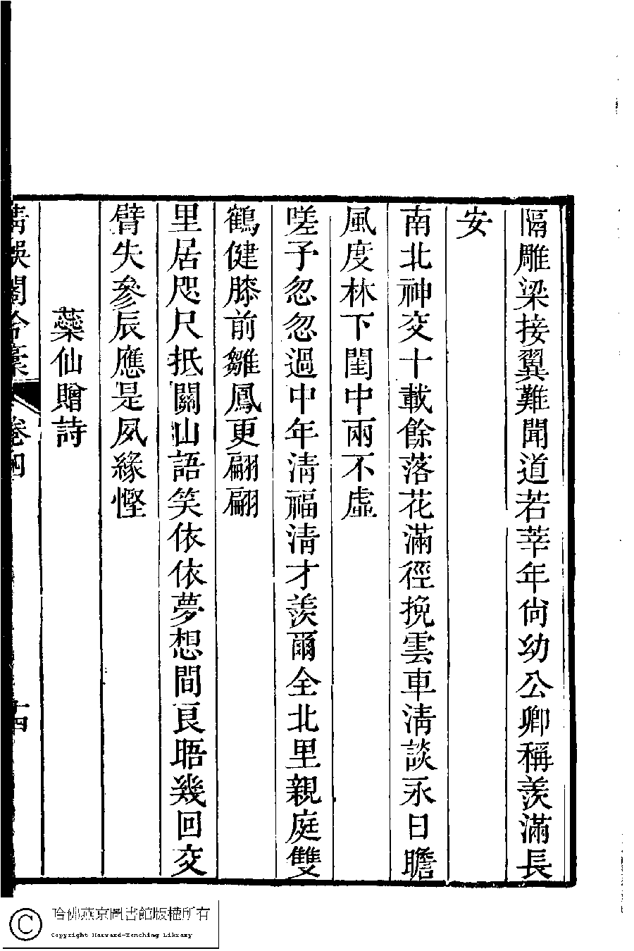 | (PRINT FRIENDLY VERSION) 清娛閣吟稾﹕六卷(清鮑之蕙撰)。嘉慶16年 [1811]刻本 ![]() 頁碼 : 4.14a | 点 击 放 大 | 清娛閣吟稾﹕六卷(清鮑之蕙撰)。嘉慶16年 [1811]刻本![]() 頁碼 : 4.13b | 点 击 放 大 | 返回 |