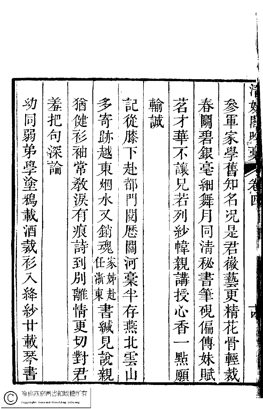 | (PRINT FRIENDLY VERSION) 清娛閣吟稾﹕六卷(清鮑之蕙撰)。嘉慶16年 [1811]刻本 ![]() 頁碼 : 4.15a | 点 击 放 大 | 清娛閣吟稾﹕六卷(清鮑之蕙撰)。嘉慶16年 [1811]刻本![]() 頁碼 : 4.14b | 点 击 放 大 | 清娛閣吟稾﹕六卷(清鮑之蕙撰)。嘉慶16年 [1811]刻本![]() 頁碼 : 4.14a | 点 击 放 大 | 返回 |