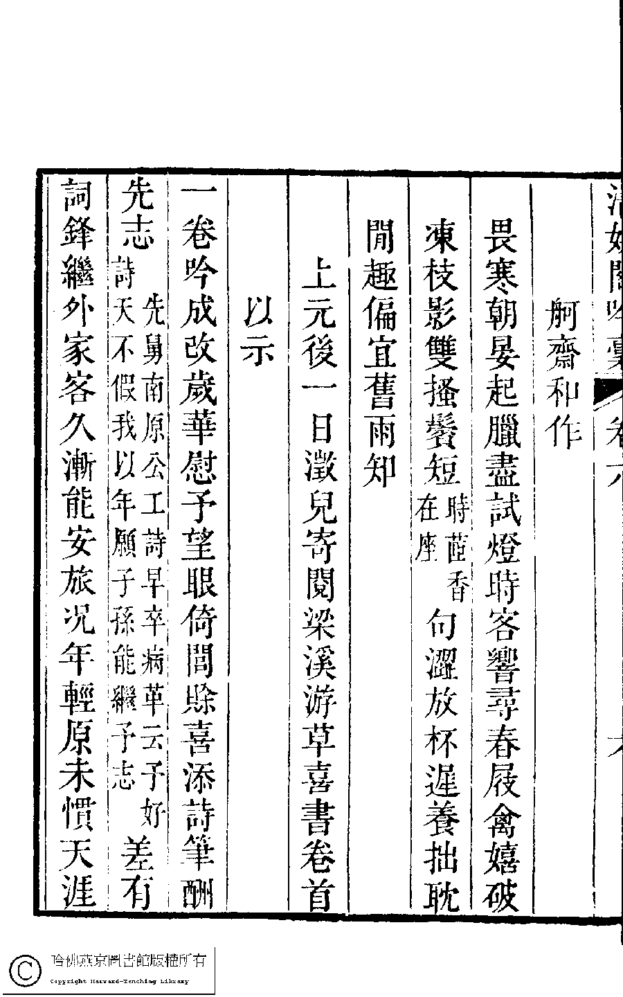 | (PRINT FRIENDLY VERSION) 清娛閣吟稾﹕六卷(清鮑之蕙撰)。嘉慶16年 [1811]刻本 ![]() 頁碼 : 6.7a | 点 击 放 大 | 清娛閣吟稾﹕六卷(清鮑之蕙撰)。嘉慶16年 [1811]刻本![]() 頁碼 : 6.6b | 点 击 放 大 | 返回 |