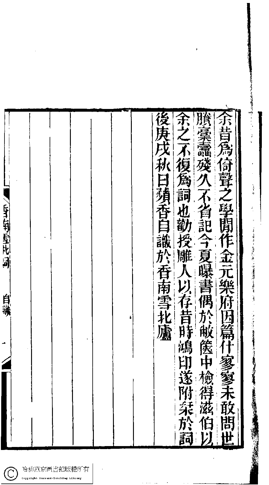 | (PRINT FRIENDLY VERSION) 林下雅音集﹕五種(淸冒俊輯) : 香南雪北詞: 一卷。淸光緖十年(1884)刻本。 ![]() 頁碼 : 自識.1b | 点 击 放 大 | 林下雅音集﹕五種(淸冒俊輯) : 香南雪北詞: 一卷。淸光緖十年(1884)刻本。![]() 頁碼 : 自識.1a | 点 击 放 大 | 返回 |