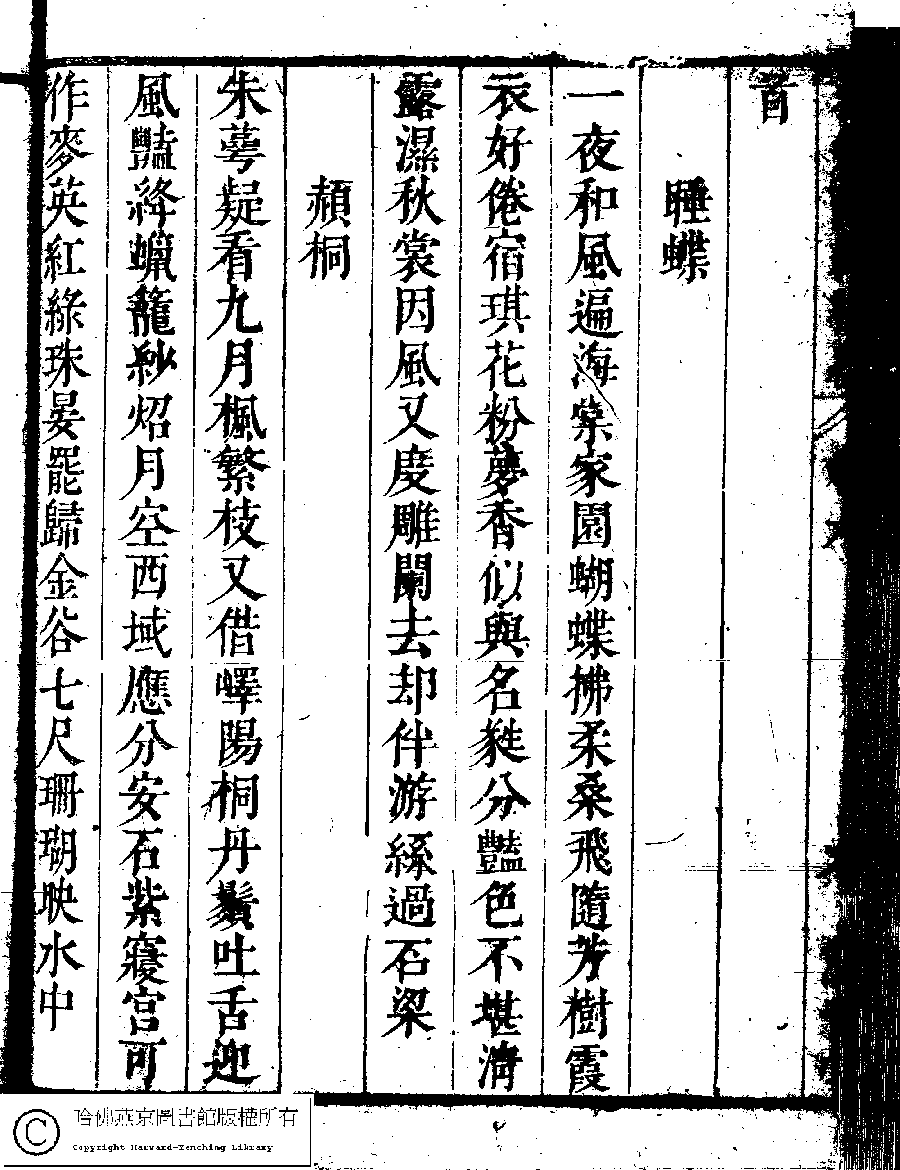 | (PRINT FRIENDLY VERSION) 名媛詩緯初編(清王端淑輯)。清康熙六年(1667)清音堂刻本 ![]() 頁碼 : 6.6b | 点 击 放 大 | 返回 |