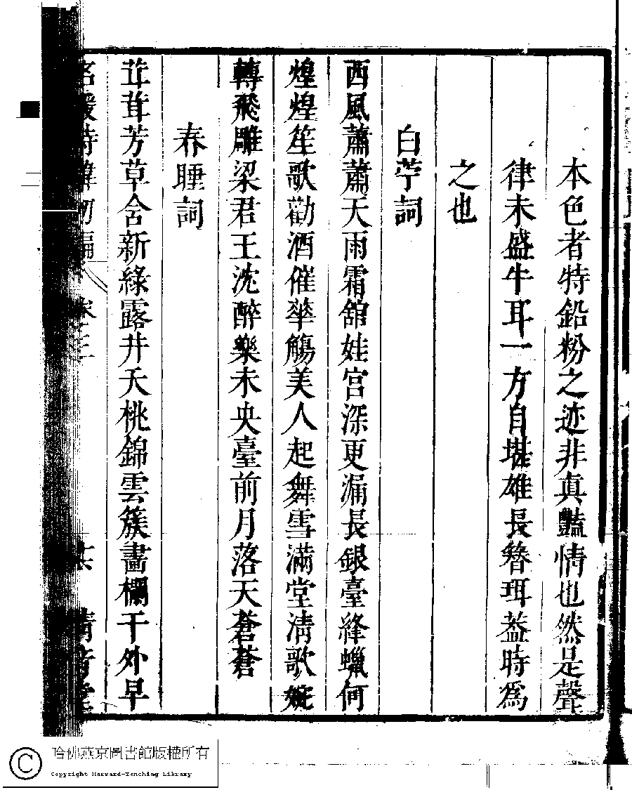 | (PRINT FRIENDLY VERSION) 名媛詩緯初編(清王端淑輯)。清康熙六年(1667)清音堂刻本 ![]() 頁碼 : 3.16a | 点 击 放 大 | 返回 |