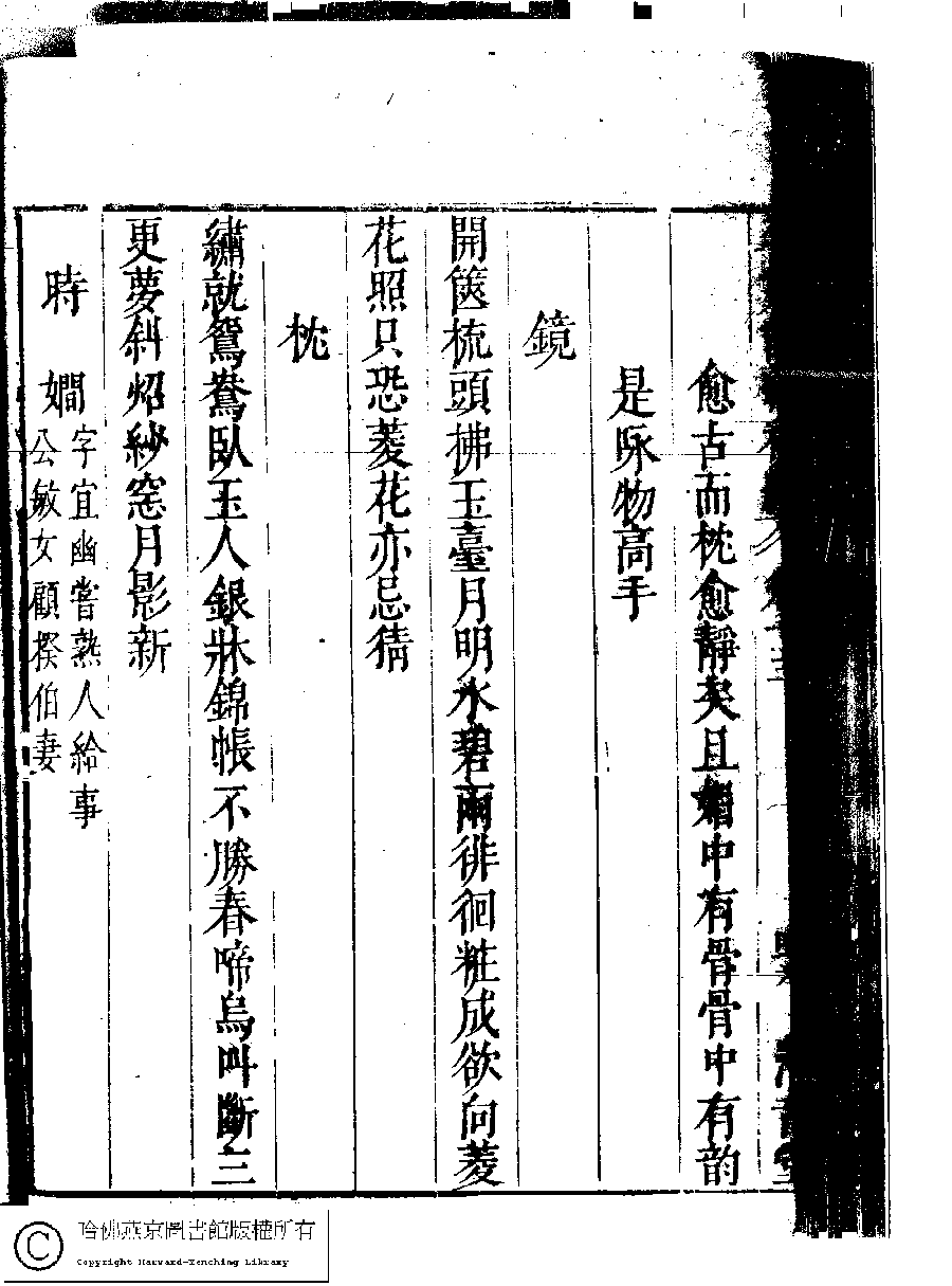 | (PRINT FRIENDLY VERSION) 名媛詩緯初編(清王端淑輯)。清康熙六年(1667)清音堂刻本 ![]() 頁碼 : 13.46b | 点 击 放 大 | 返回 |
