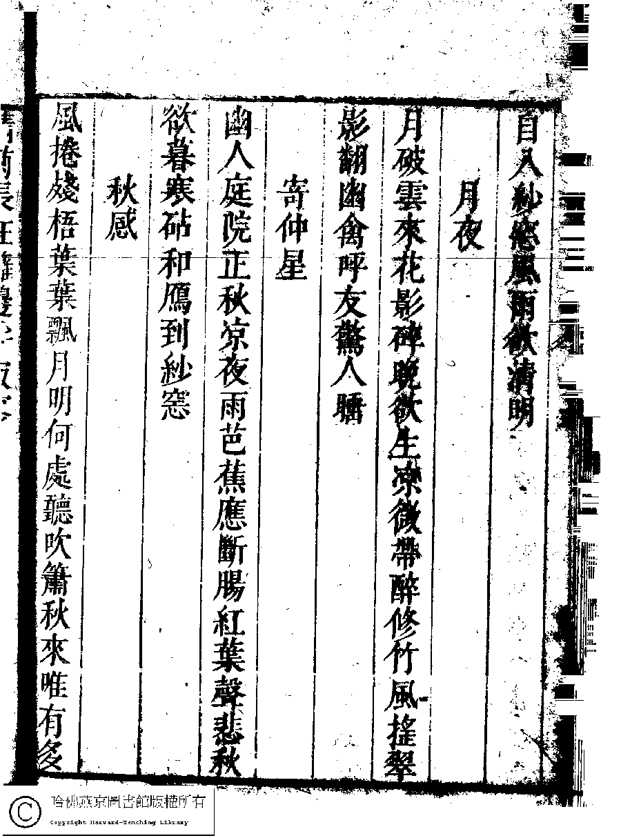 | (PRINT FRIENDLY VERSION) 名媛詩緯初編(清王端淑輯)。清康熙六年(1667)清音堂刻本 ![]() 頁碼 : 15.3b | 点 击 放 大 | 返回 |