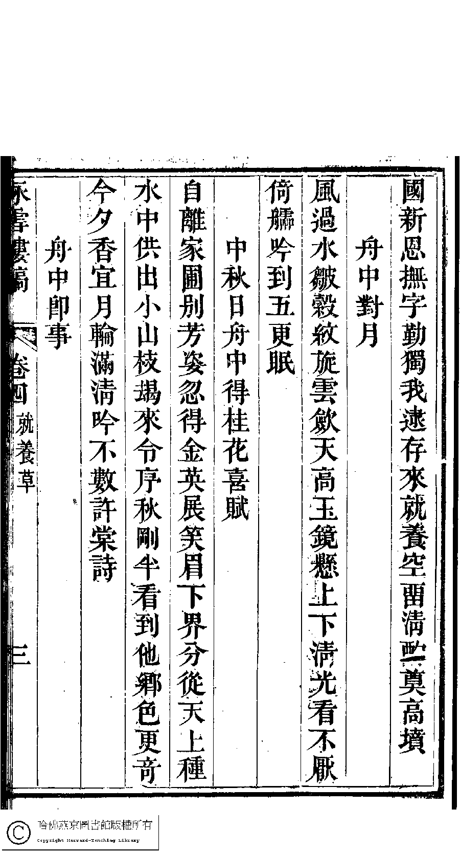 | (PRINT FRIENDLY VERSION) 詠雪樓稿﹕五卷,卷首一卷,附一卷(清甘立媃撰)。清道光二十三年(1843)徐心田半偈齋刻本。 ![]() 頁碼 : 4.3a | 点 击 放 大 | 返回 |