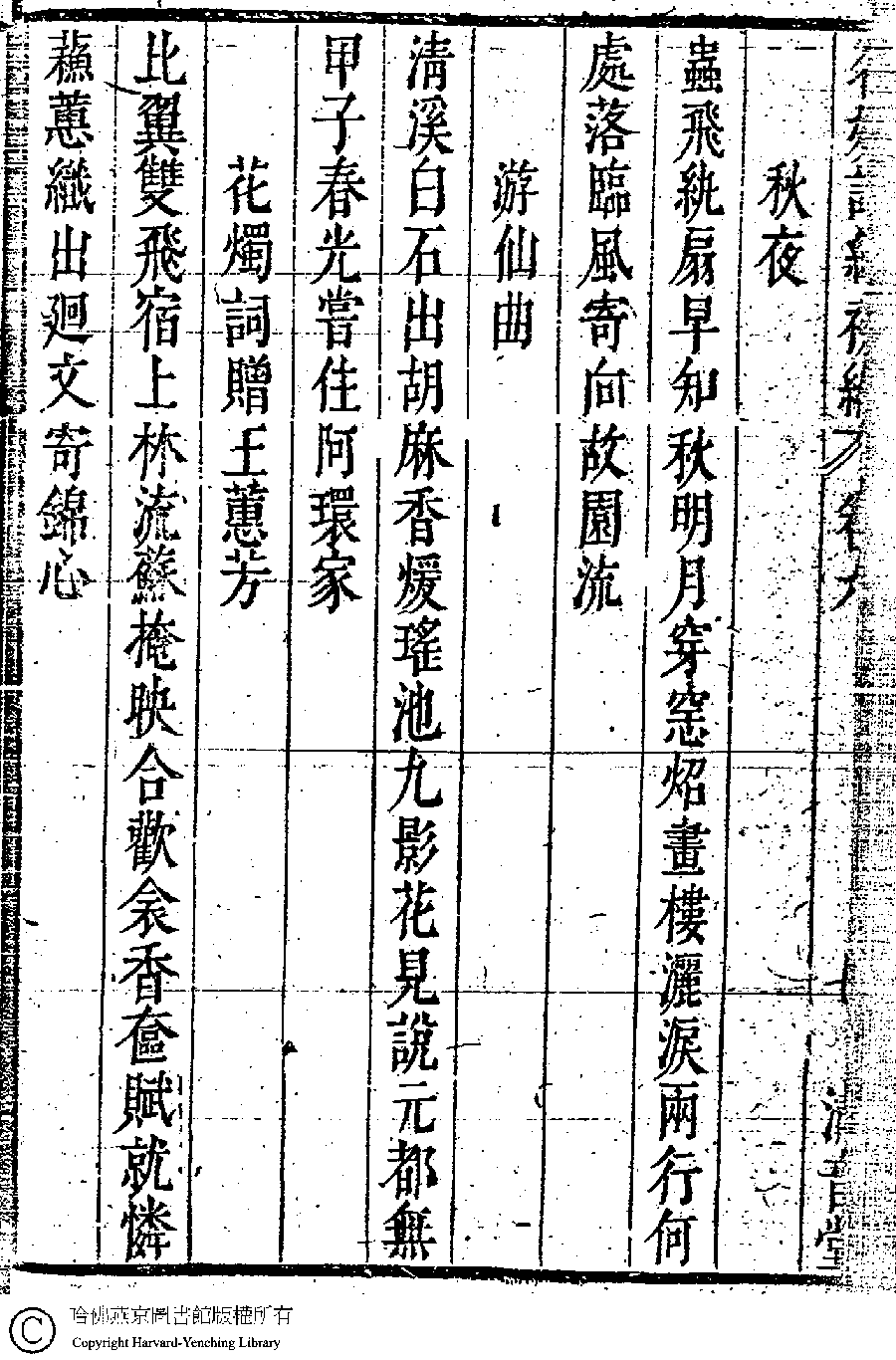 | (PRINT FRIENDLY VERSION) 名媛詩緯初編(清王端淑輯)。清康熙六年(1667)清音堂刻本 ![]() 頁碼 : 6.7b | 点 击 放 大 | 返回 |