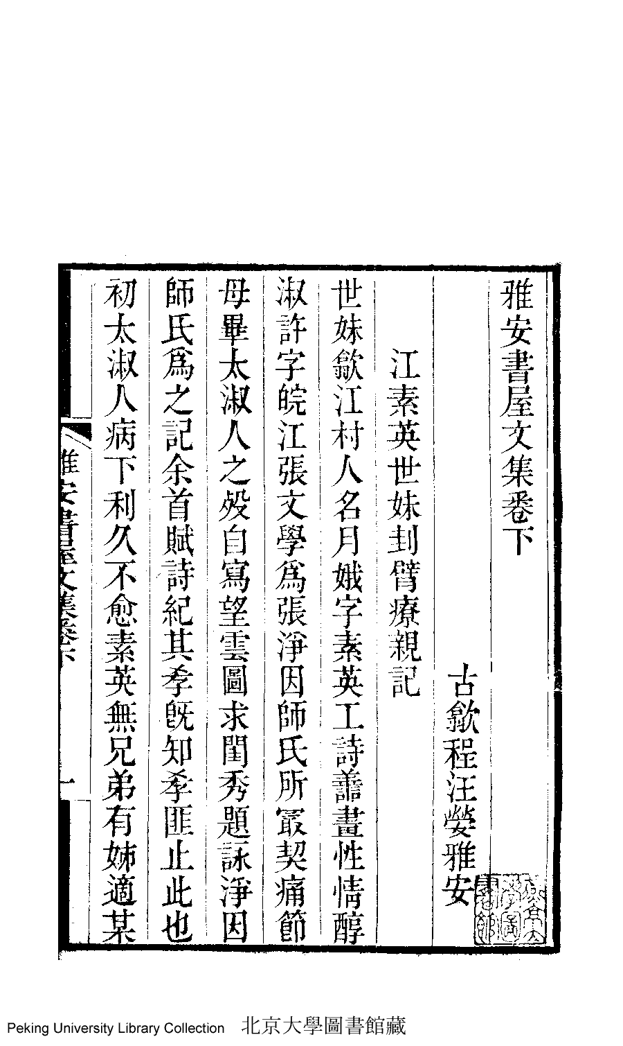 | 原書: 雅安書屋文集﹕二卷(清汪嫈撰) |