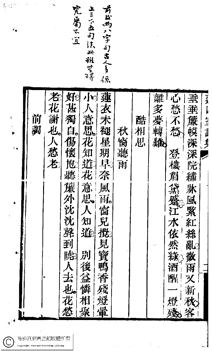 | (PRINT FRIENDLY VERSION) 蓮因室詩集﹕二卷﹐詞集﹕一卷(清鄭蘭孫撰)。清光緒元年(1875)刻本 ![]() 頁碼 : 3.2b | 点 击 放 大 | 蓮因室詩集﹕二卷﹐詞集﹕一卷(清鄭蘭孫撰)。清光緒元年(1875)刻本![]() 頁碼 : 3.2a | 点 击 放 大 | 返回 |