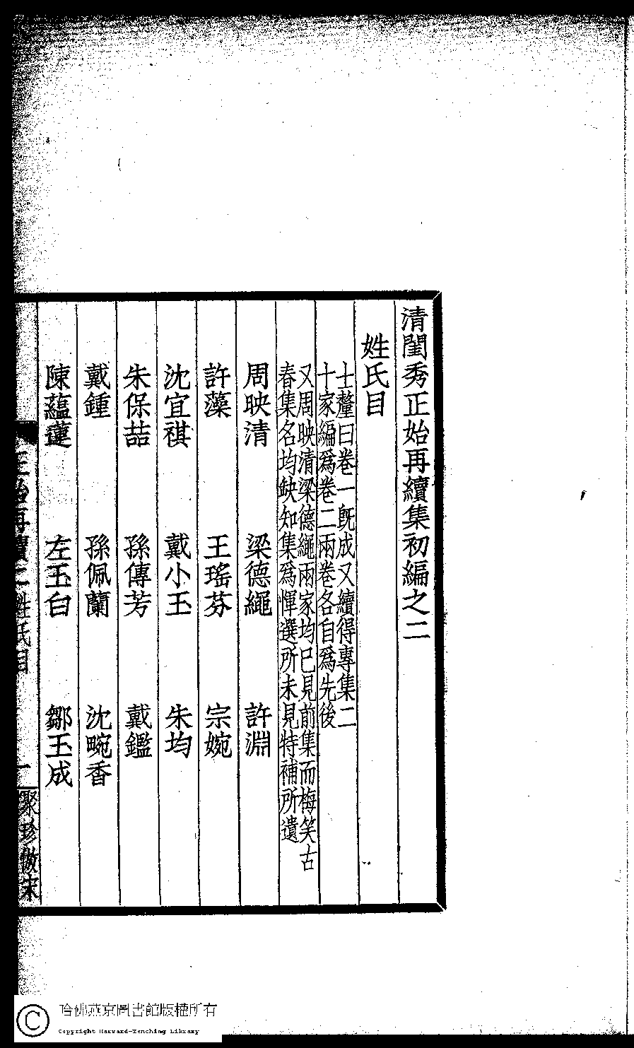 | (PRINT FRIENDLY VERSION) 閨秀正始再續集(民國單士釐輯)。民國元年(1911)活字印本 ![]() 頁碼 : 姓氏目.1b | 点 击 放 大 | 閨秀正始再續集(民國單士釐輯)。民國元年(1911)活字印本![]() 頁碼 : 姓氏目.1a | 点 击 放 大 | 返回 |