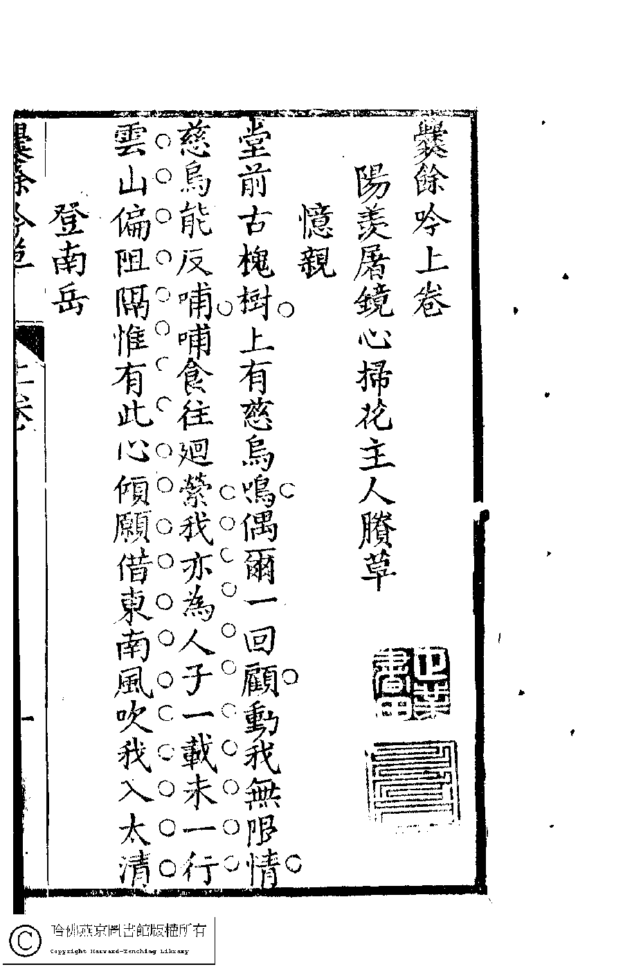 | (PRINT FRIENDLY VERSION) 爨餘吟﹕二卷(清屠鏡心撰)。清同治九年(1870)刻本 ![]() 頁碼 : 1.1b | 点 击 放 大 | 爨餘吟﹕二卷(清屠鏡心撰)。清同治九年(1870)刻本![]() 頁碼 : 1.1a | 点 击 放 大 | 返回 |