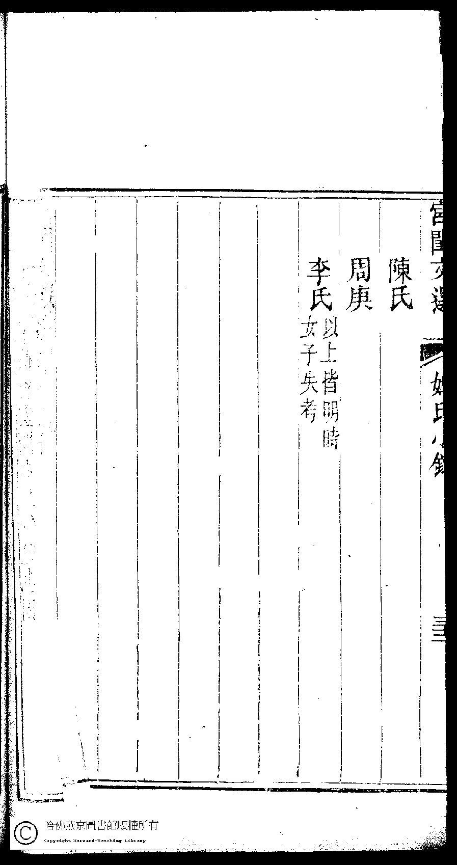 | (PRINT FRIENDLY VERSION) 宮閨文選:二十六卷,姓氏小錄 : 一卷(清周壽昌輯訂)。道光二十六年(1846)開雕 ![]() 頁碼 : 姓氏小錄.32b | 点 击 放 大 | 宮閨文選:二十六卷,姓氏小錄 : 一卷(清周壽昌輯訂)。道光二十六年(1846)開雕![]() 頁碼 : 姓氏小錄.32a | 点 击 放 大 | 返回 |