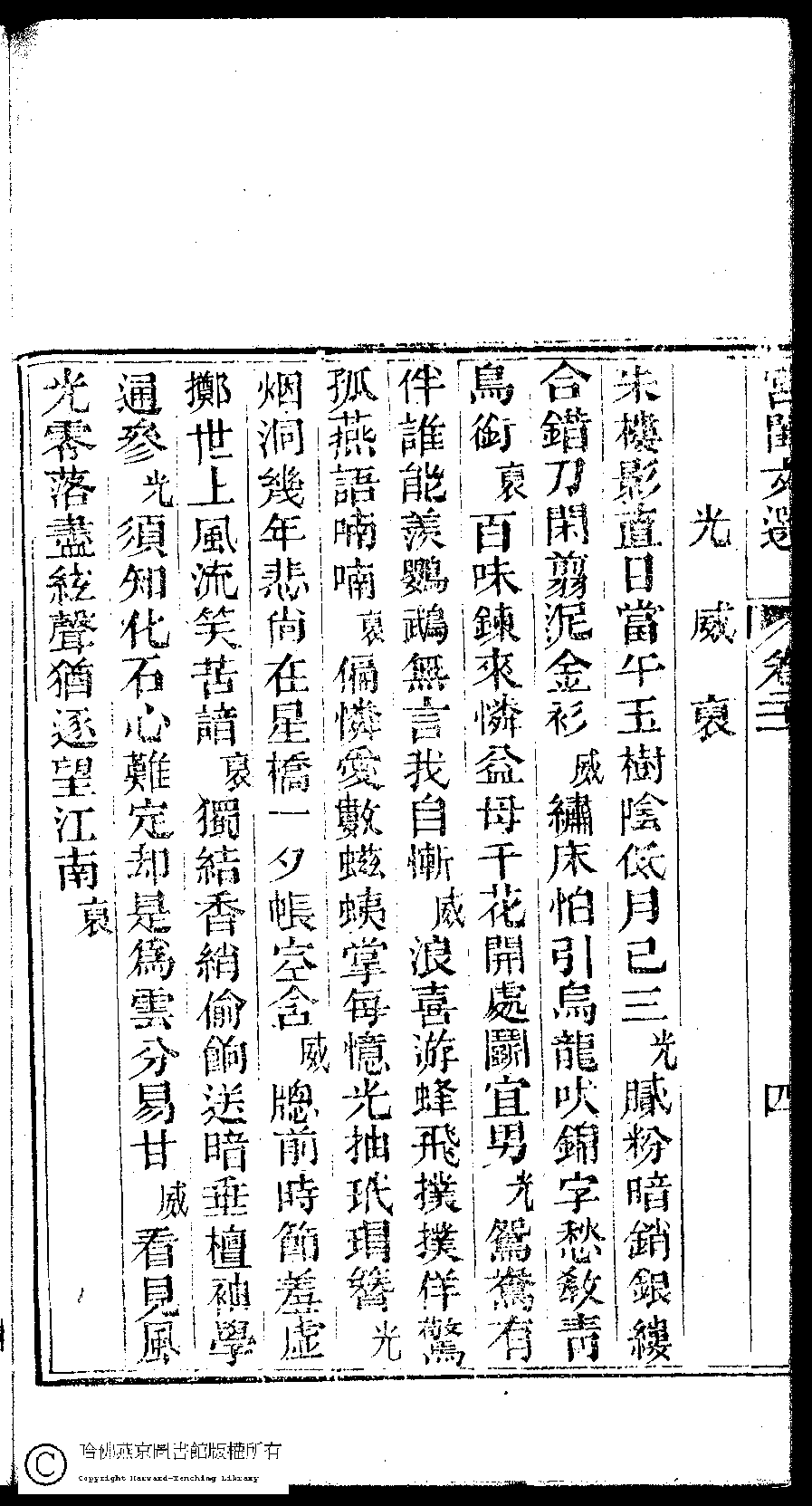 | (PRINT FRIENDLY VERSION) 宮閨文選:二十六卷,姓氏小錄 : 一卷(清周壽昌輯訂)。道光二十六年(1846)開雕 ![]() 頁碼 : 21.4b | 点 击 放 大 | 宮閨文選:二十六卷,姓氏小錄 : 一卷(清周壽昌輯訂)。道光二十六年(1846)開雕![]() 頁碼 : 21.4a | 点 击 放 大 | 返回 |