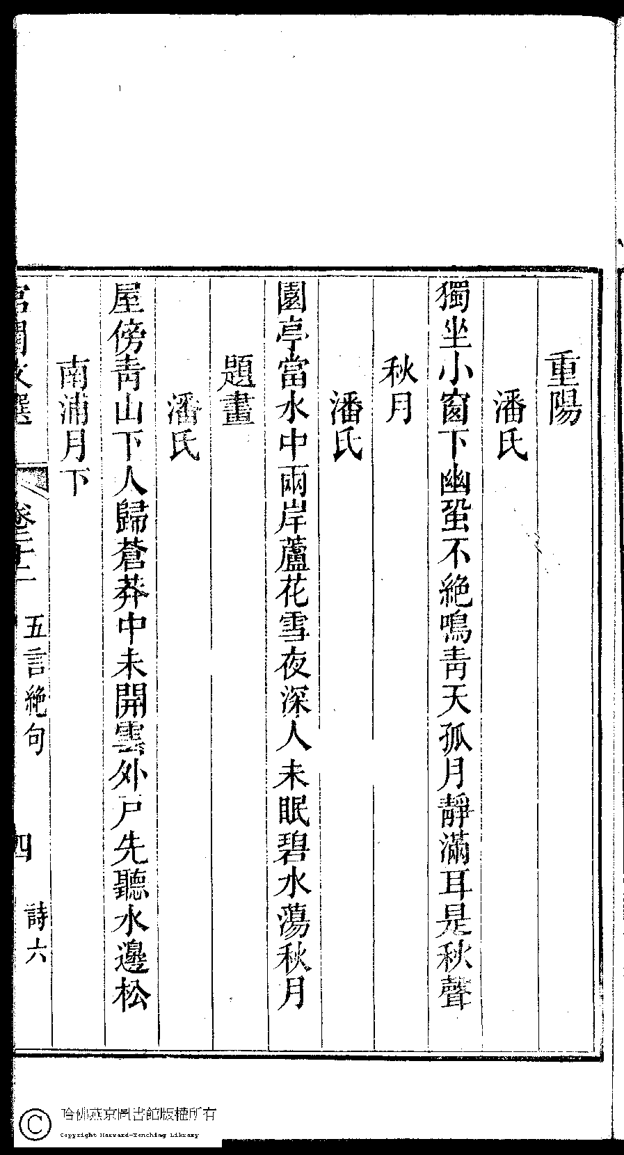 | (PRINT FRIENDLY VERSION) 宮閨文選:二十六卷,姓氏小錄 : 一卷(清周壽昌輯訂)。道光二十六年(1846)開雕 ![]() 頁碼 : 22.4a | 点 击 放 大 | 返回 |