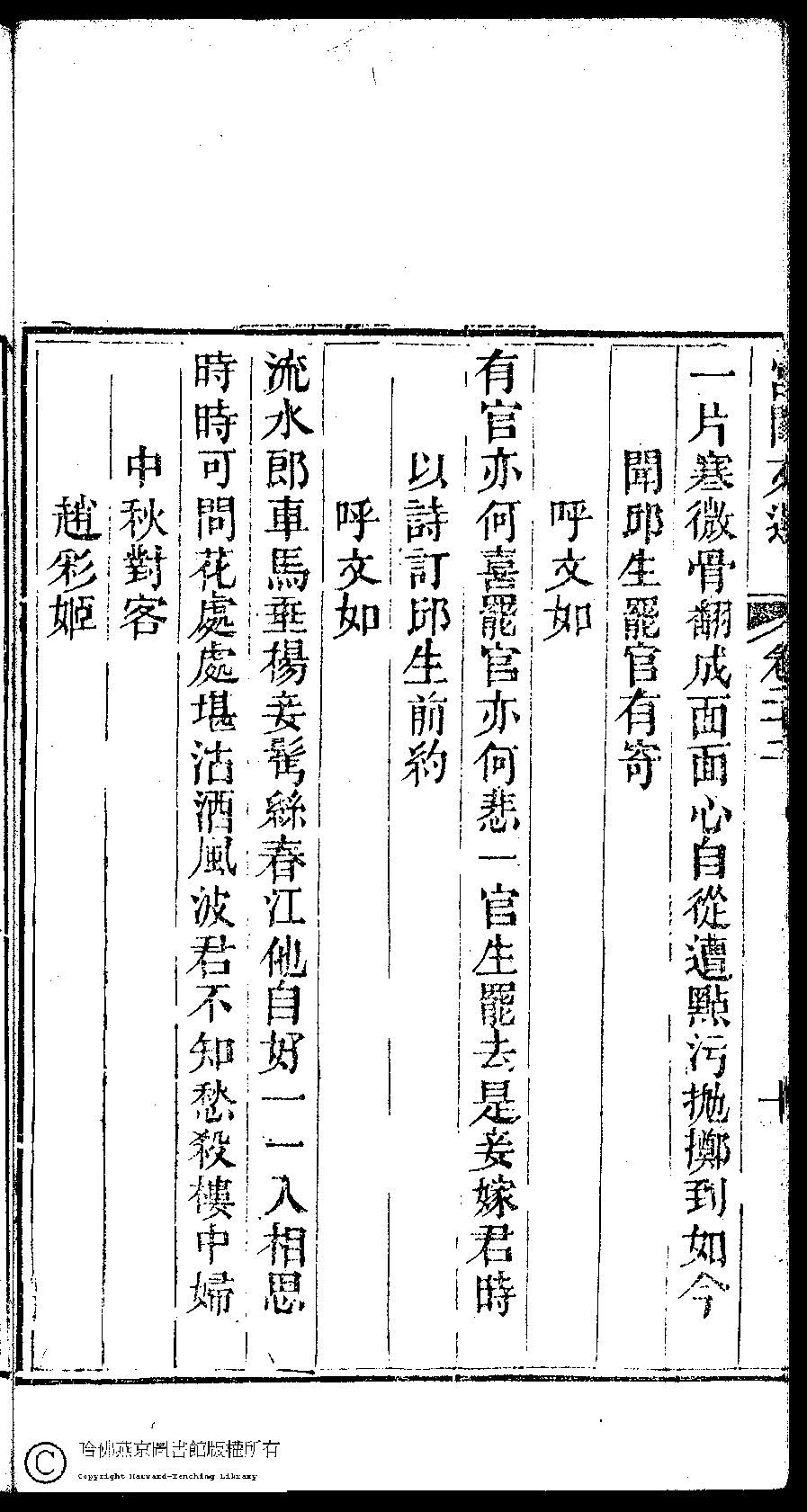 | (PRINT FRIENDLY VERSION) 宮閨文選:二十六卷,姓氏小錄 : 一卷(清周壽昌輯訂)。道光二十六年(1846)開雕 ![]() 頁碼 : 22.11a | 点 击 放 大 | 宮閨文選:二十六卷,姓氏小錄 : 一卷(清周壽昌輯訂)。道光二十六年(1846)開雕![]() 頁碼 : 22.10b | 点 击 放 大 | 返回 |