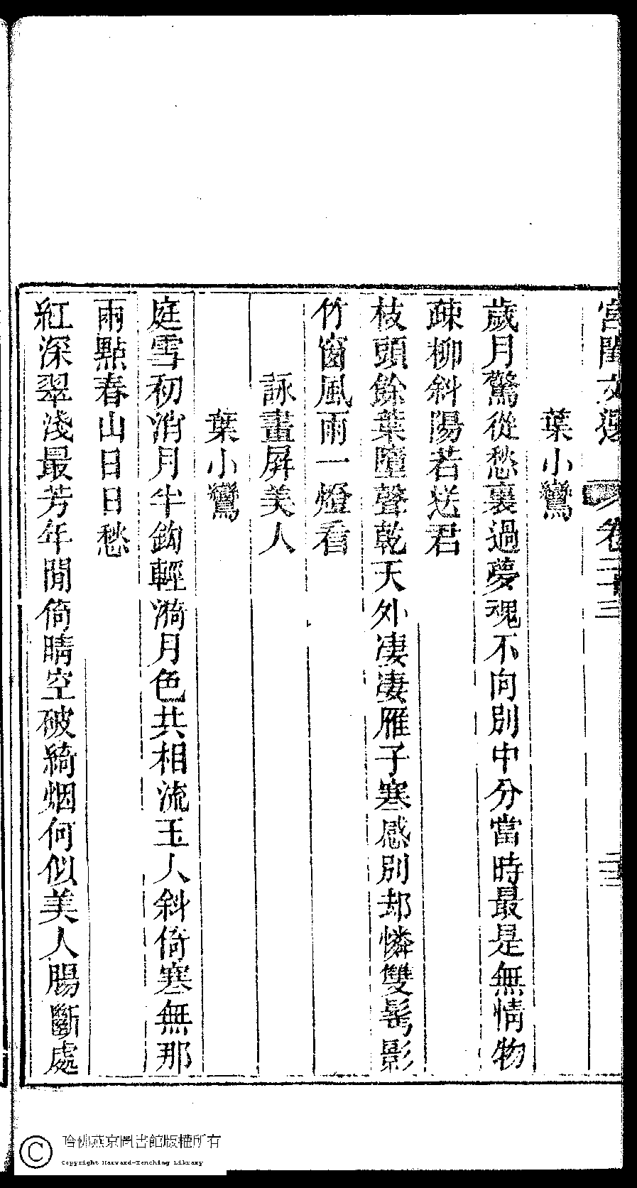 | (PRINT FRIENDLY VERSION) 宮閨文選:二十六卷,姓氏小錄 : 一卷(清周壽昌輯訂)。道光二十六年(1846)開雕 ![]() 頁碼 : 23.22b | 点 击 放 大 | 宮閨文選:二十六卷,姓氏小錄 : 一卷(清周壽昌輯訂)。道光二十六年(1846)開雕![]() 頁碼 : 23.22a | 点 击 放 大 | 返回 |