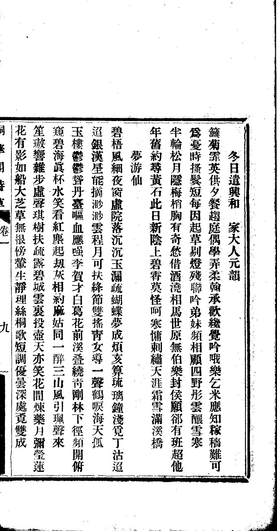 | (PRINT FRIENDLY VERSION) 桐華閣詩集:詩草三卷,詩餘一卷(清慶鳳暉撰)。民國初年(1912)刊本 ![]() 頁碼 : 1.9a | 点 击 放 大 | 返回 |