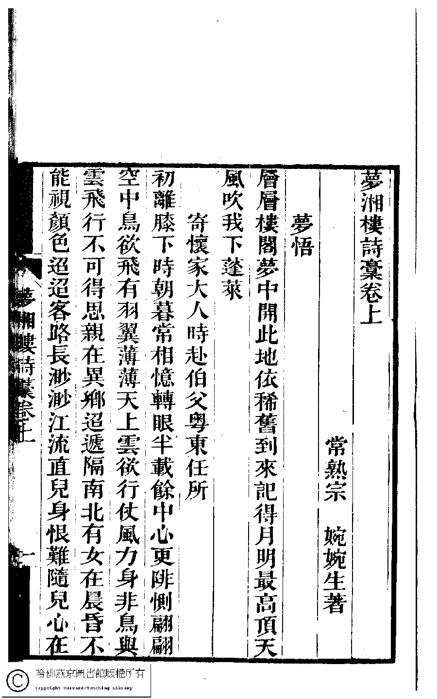 | 原書: 夢湘樓詩稿﹕二卷﹐詞稿﹕一卷﹔繭香館吟艸﹕一卷﹐繡餘詞草﹕一卷(清宗婉等撰): 夢湘樓詩稿﹕二卷﹐詞稿﹕一卷 |