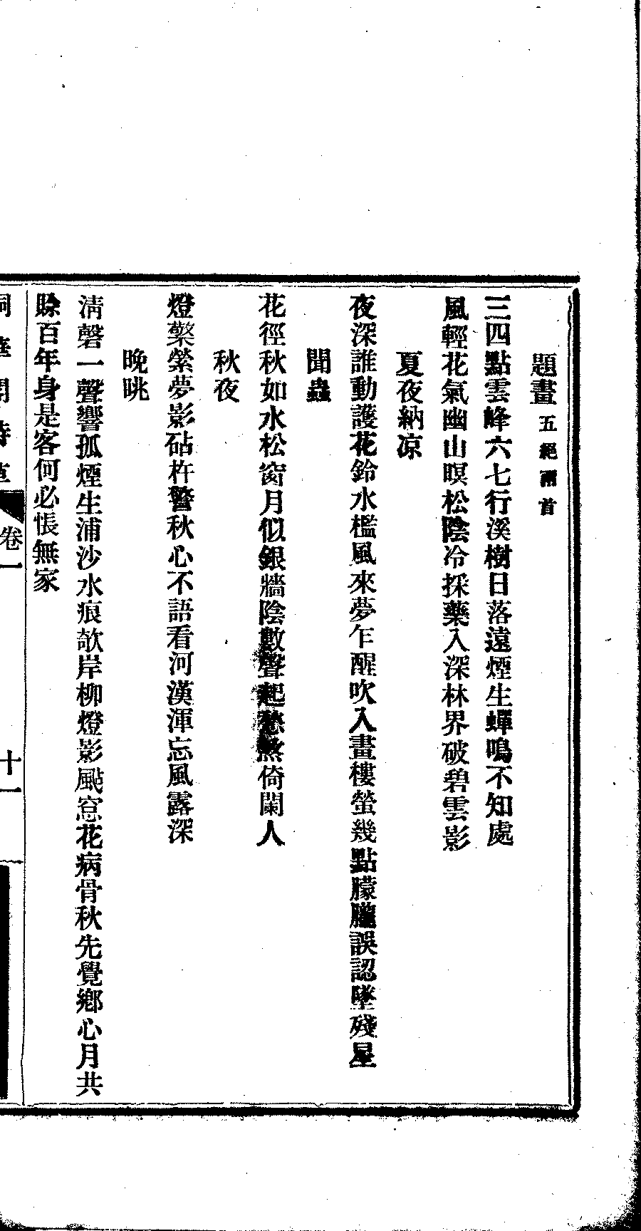 | (PRINT FRIENDLY VERSION) 桐華閣詩集:詩草三卷,詩餘一卷(清慶鳳暉撰)。民國初年(1912)刊本 ![]() 頁碼 : 1.11a | 点 击 放 大 | 返回 |