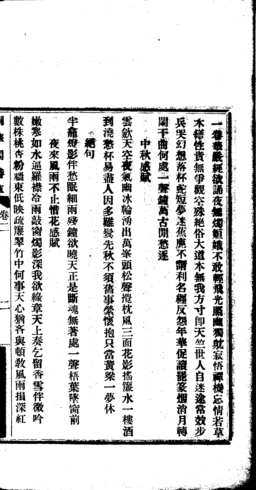 | (PRINT FRIENDLY VERSION) 桐華閣詩集:詩草三卷,詩餘一卷(清慶鳳暉撰)。民國初年(1912)刊本 ![]() 頁碼 : 2.2a | 点 击 放 大 | 返回 |