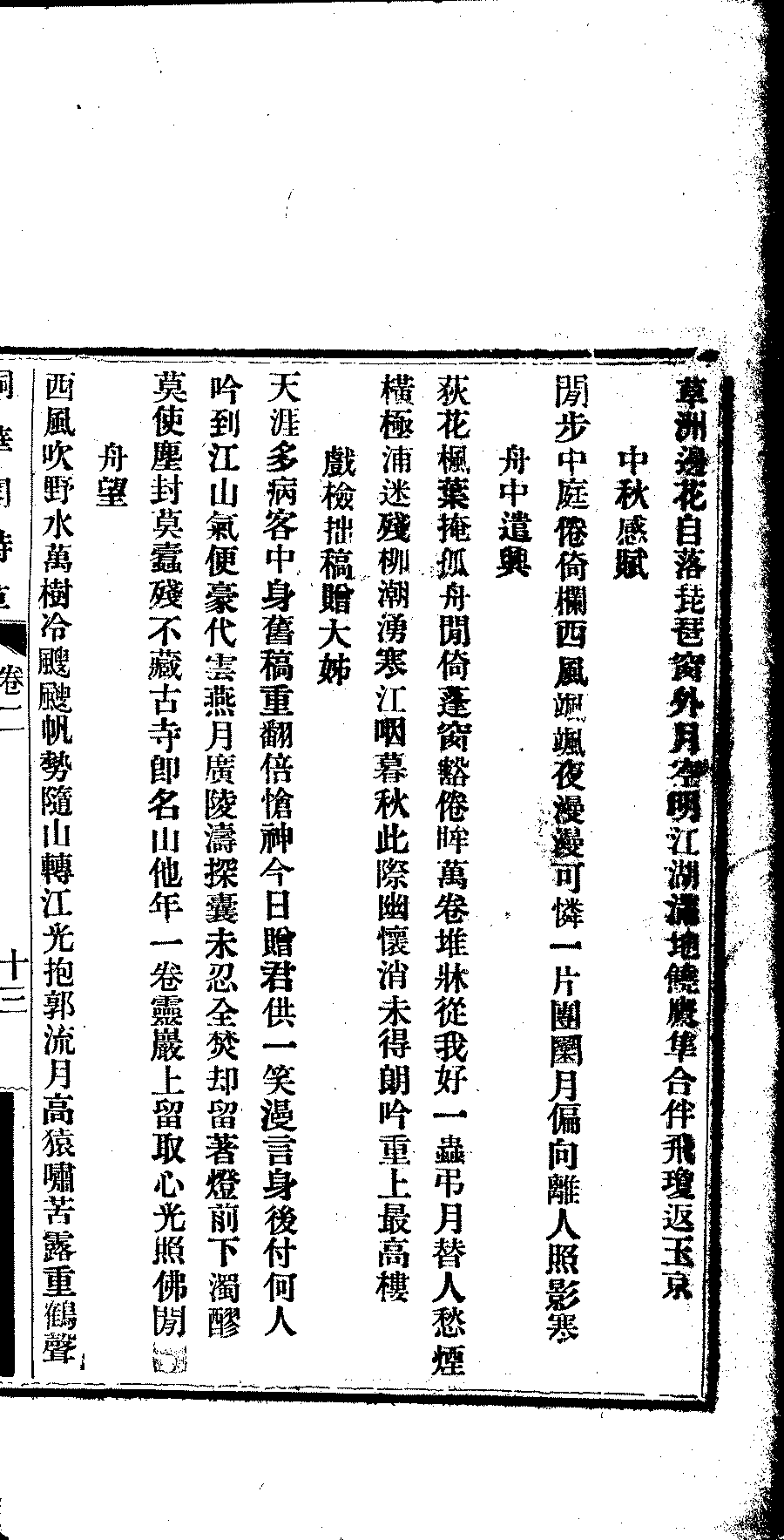 | (PRINT FRIENDLY VERSION) 桐華閣詩集:詩草三卷,詩餘一卷(清慶鳳暉撰)。民國初年(1912)刊本 ![]() 頁碼 : 2.13a | 点 击 放 大 | 桐華閣詩集:詩草三卷,詩餘一卷(清慶鳳暉撰)。民國初年(1912)刊本![]() 頁碼 : 2.12b | 点 击 放 大 | 返回 |