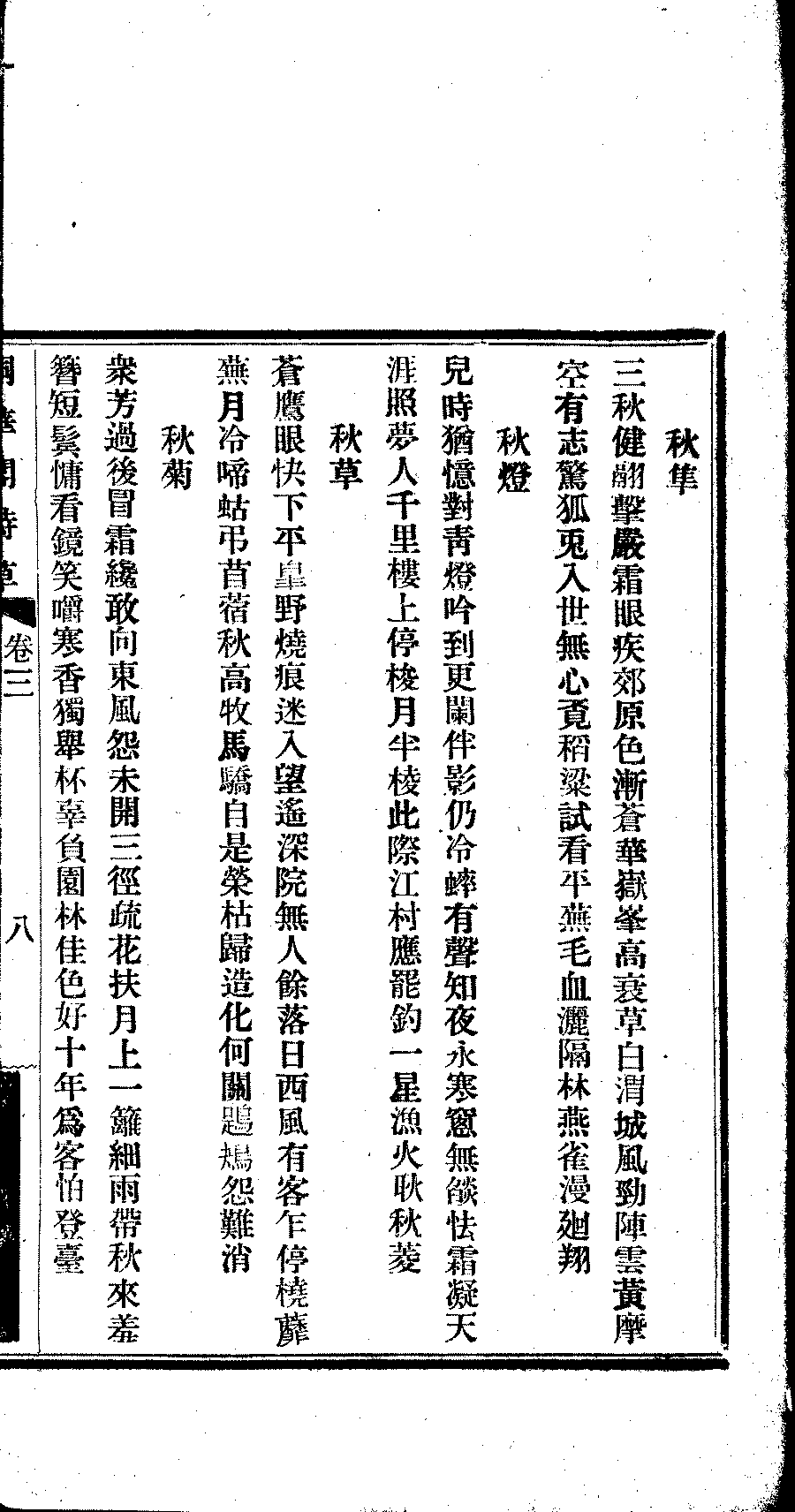 | (PRINT FRIENDLY VERSION) 桐華閣詩集:詩草三卷,詩餘一卷(清慶鳳暉撰)。民國初年(1912)刊本 ![]() 頁碼 : 3.8a | 点 击 放 大 | 返回 |
